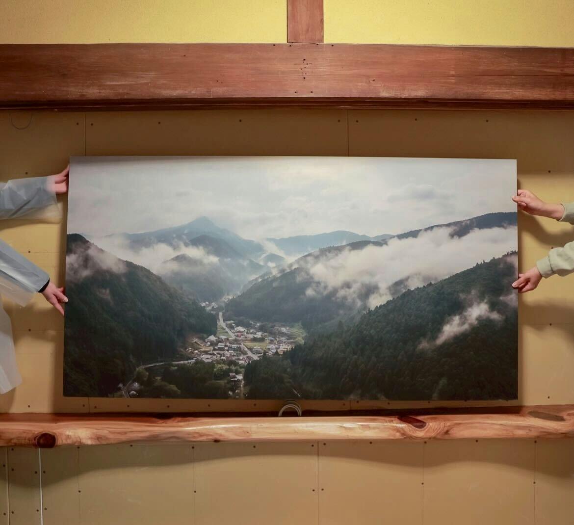 東吉野村在住の写真家・福井さんの特大パネルのサイズ合わせの様子。