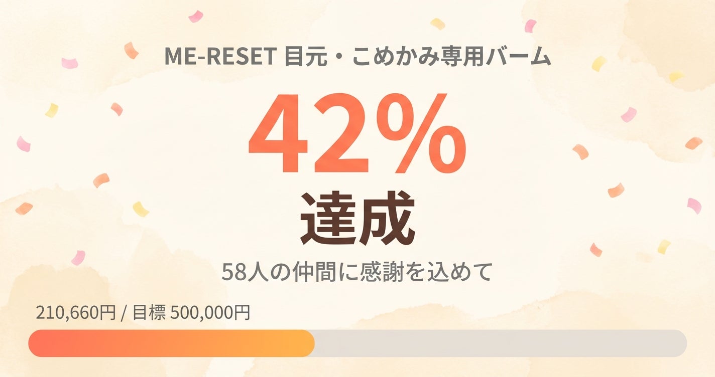 みなさん、こんにちは!ME-RESET(メリセット)を開発する、C&H代表の岩間です。前回の活動報告で「ネクストゴールを準備中」とお伝えしていました。 本日は3つお知らせがあります!ネクストゴールに挑戦します!目標額を達成できたのは、皆さんのおかげです。本当にありがとうございます! ここでいったん立ち止まらず、もう一歩先へ進みたいと思います。次の目標額に向けていただいた支援は、新しいCBDアイテムの開発費に使わせていただきます。目元・こめかみ向けのME-RESETに続いて、心身のケアにもCBDを活かしていく——その第一歩です。残り1ヶ月を切りましたが、引き続き応援していただけるとうれしいです!新しいリターンを追加しました!ラボで開発した全身マッサージ用バームとME-RESETを組み合わせた「全身バームセット(¥7,980)」が新しく登場!あわせて、売り切れとなっていた「通常1個」と「3個セット」の在庫も追加しました。ぜひ一度体験してみてください^^内容量を6gから7gに変更しました当初、ME-RESETの内容量は6gを予定していましたが、容器のサイズ調整により7gに変更しました。CBD・CBGの配合濃度に変更はありません。すでにご支援いただいた皆さんにも、内容量をアップした7gでお届けします。引き続き応援をよろしくお願いいたします!