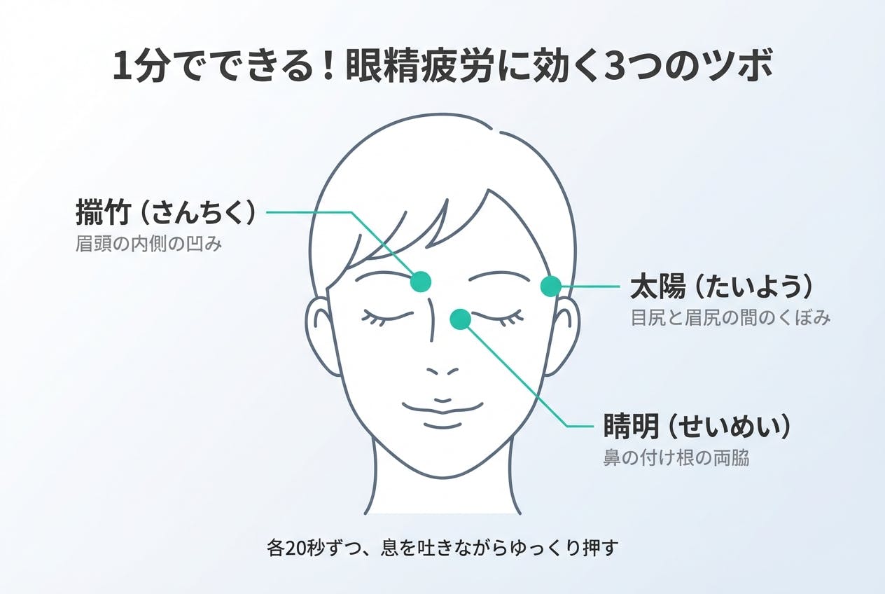 目を閉じて、目頭の内側からこめかみに向かって、指の腹でゆっくり押すようにして流します。