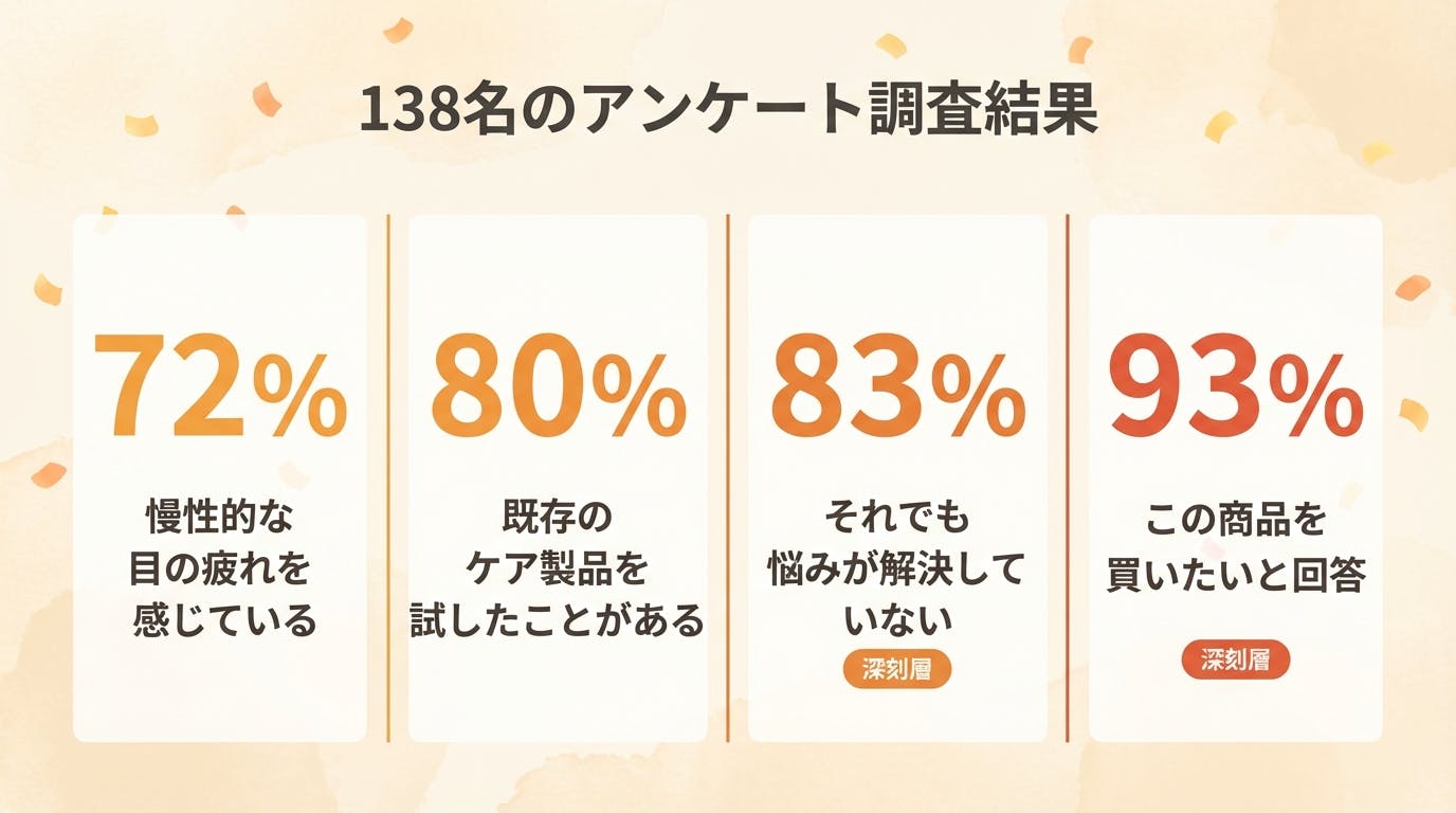 結果は予想以上でした。8割の方がすでに何かしらのケア製品を試しているのに、それでも「まだ解決できていない」と感じていた。目薬、ホットアイマスク、サプリ——いろいろ試しても満足できていない方がこんなに多いのかと。
