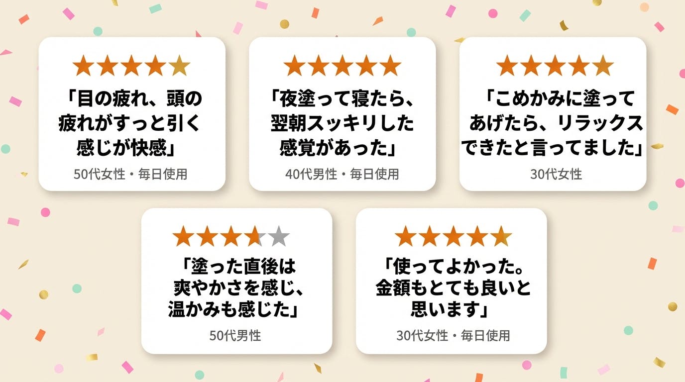 「夜塗って寝たら、翌朝スッキリした感覚があった。」 (40代男性・毎日使用)