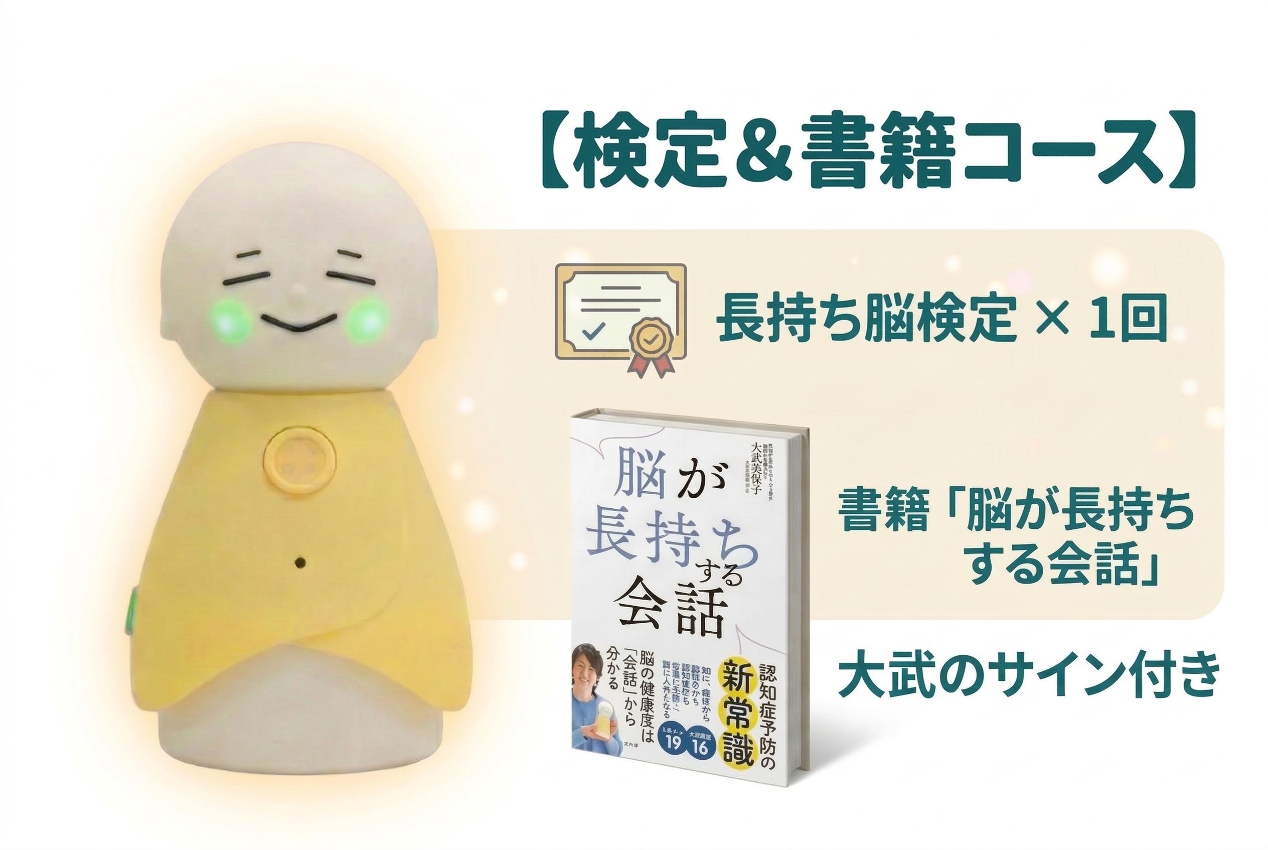 「長持ち脳検定」1回受検をご家族の2名様分、さらに大武の著書「脳が長持ちする会話」一冊に著書のサインを記載してお送りさせていただきます。