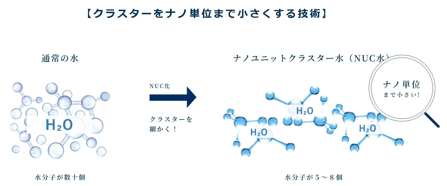 ナノユニットクラスター(NUC)とは、化粧品に配合された成分を特殊な技術により、ナノ単位まで小さくする技術で、化粧品のもつ浸透力や保湿力を高める効果があります。