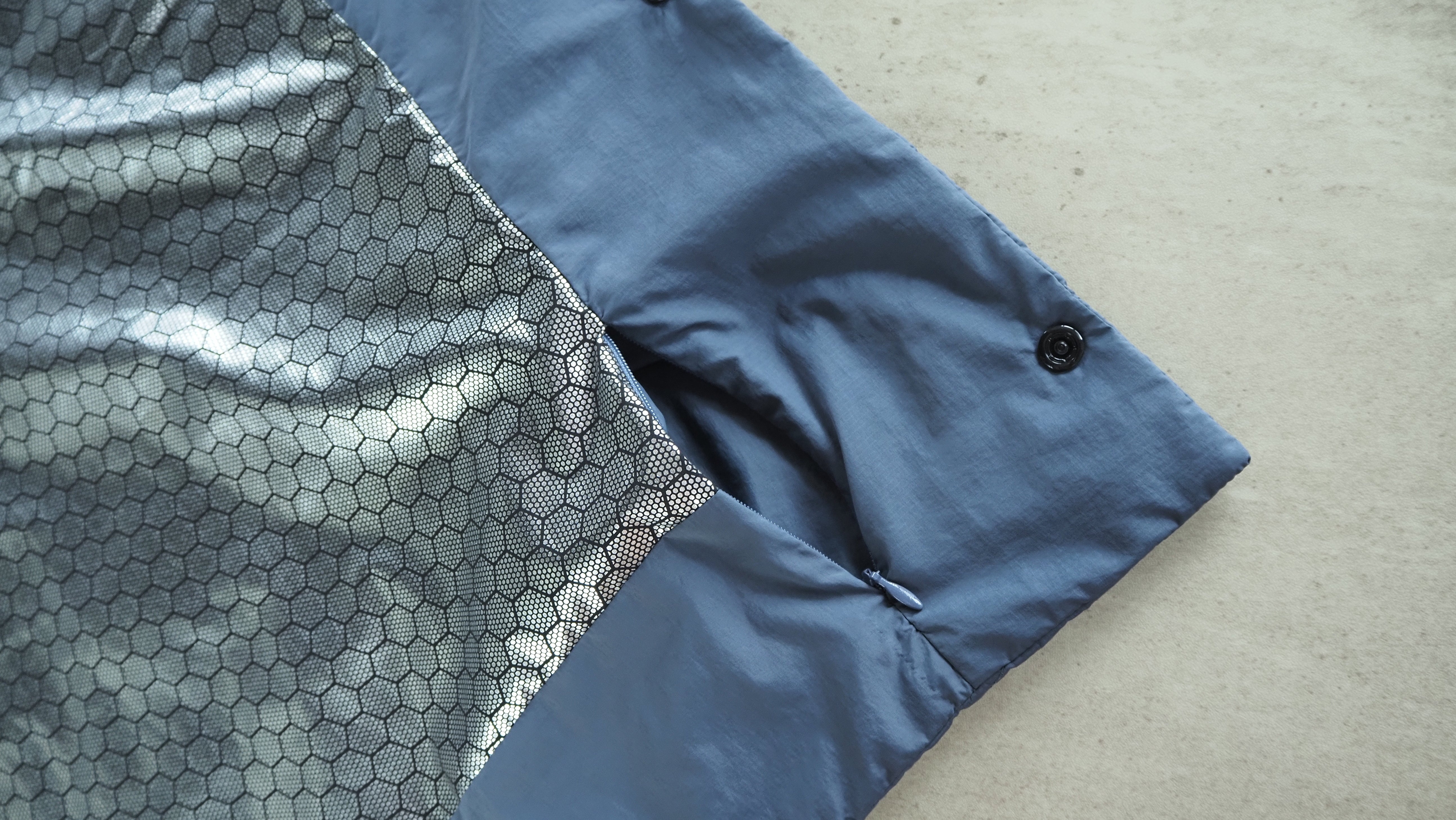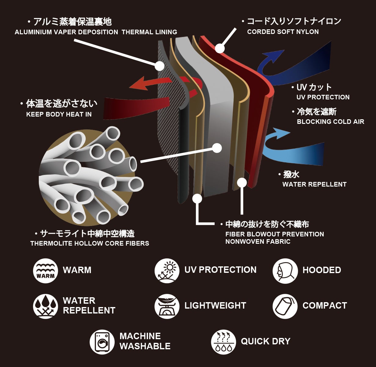 アルミニウム蒸着プリントを施した保温効果の高い裏地を採用しています。体温を反射させ暖かさをキープします。第2弾ではプリントの形状を見直し、保温性が向上しました。