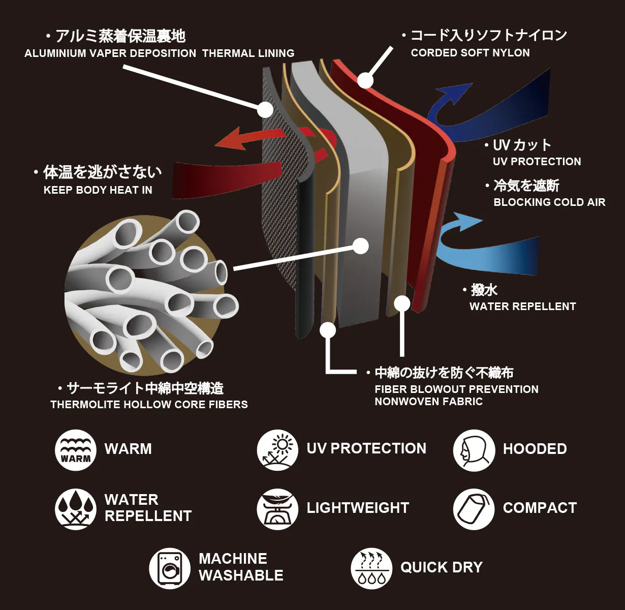 独自の5層構造で冷気を防ぎ、体温を利用した温かさをキープします。