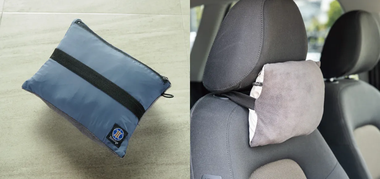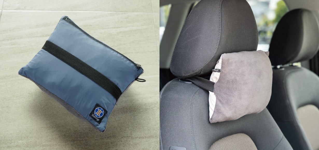 クッションには2.5cm巾のゴムバンドが付いているので、車のヘッドレストにも取り付けることができます。