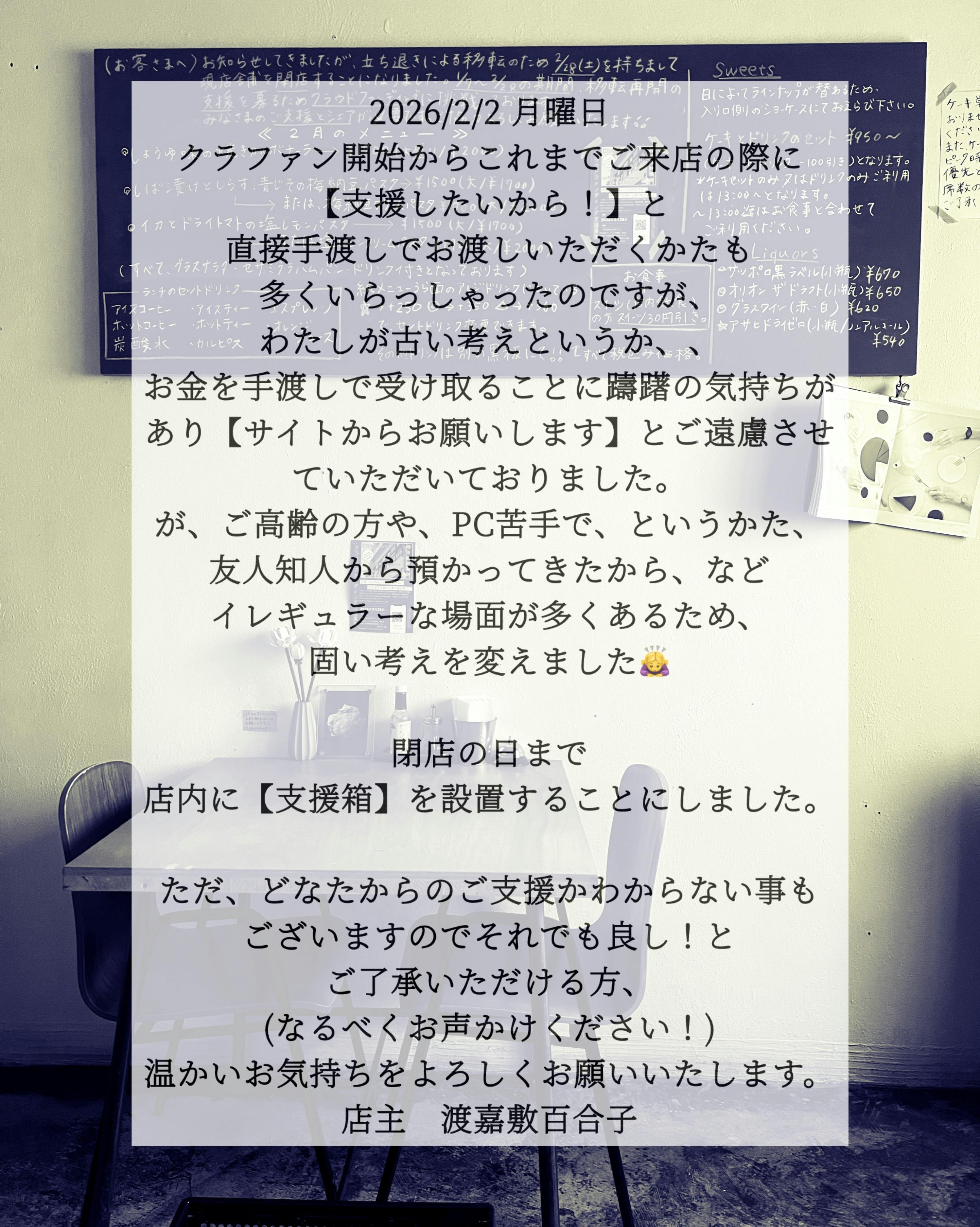 あっという間に2月です。クラファンの期日と同じくKitchenは2/28で閉店となります。立ち退きの日は6/15ですが、移転先の準備や現店舗の撤去等、やることが山積みで何から手をつけて良いのか整理出来ておりません、、