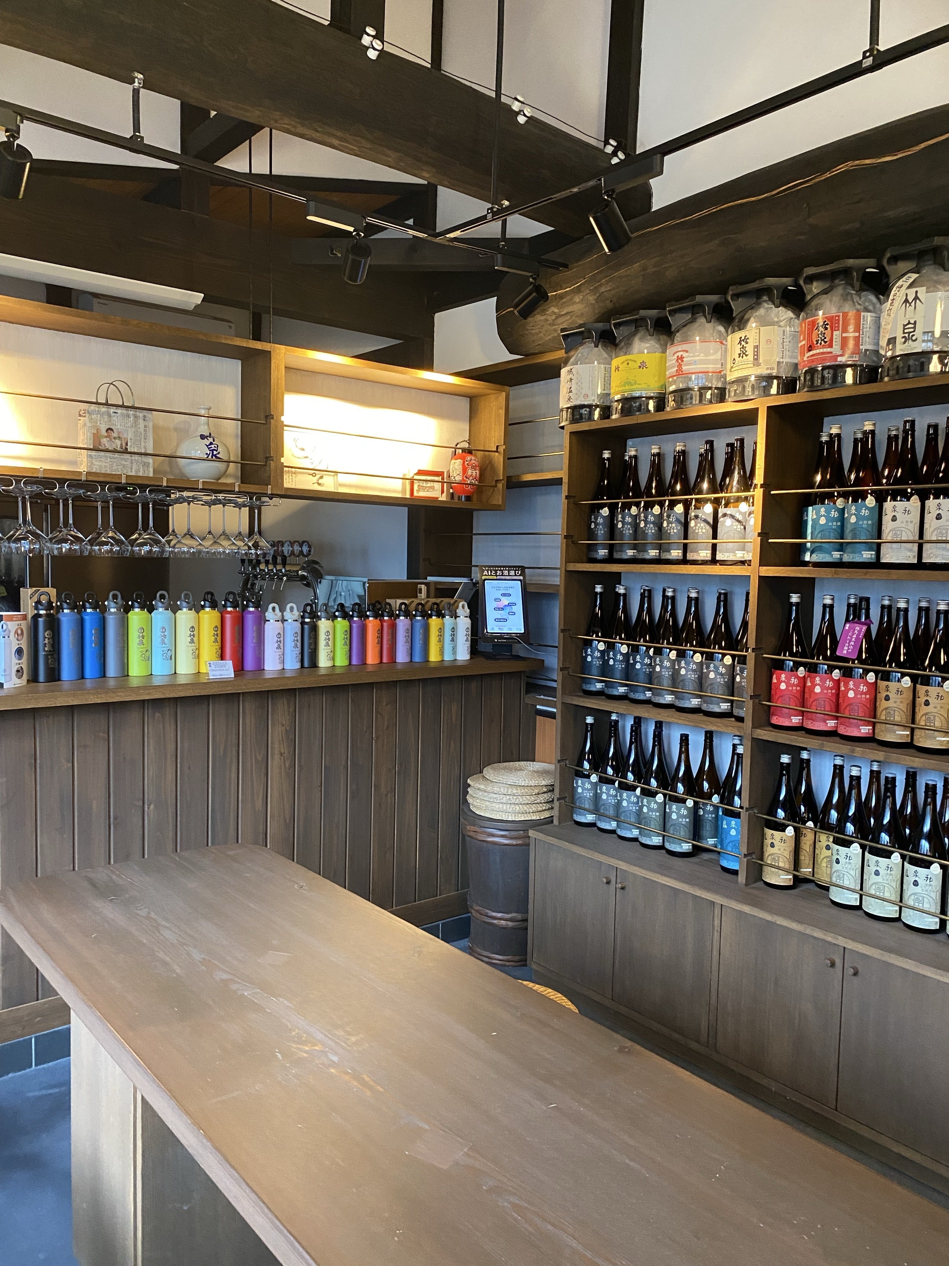 中に入ると試飲もできるスペースが広がっています。日本酒の瓶がずらり。