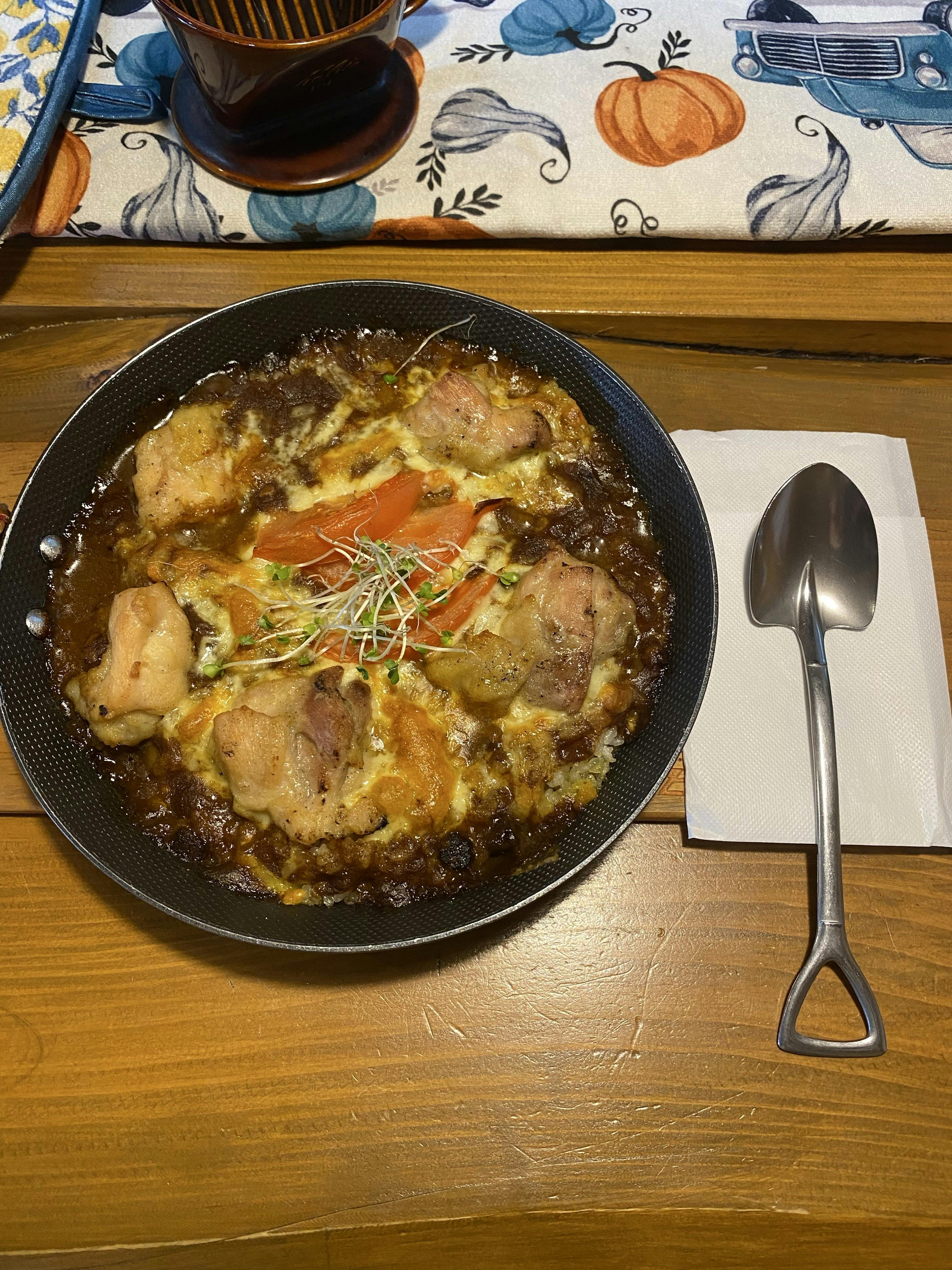 今日は「焼きカレー」をいただきました。お昼に来るのは初めてです。他にも、「シフォンケーキ」などのデザートもあり、お食事もどれもとてもおいしいです。こんな高原のお店でわんちゃんと暖かい日差しを浴びながらおいしいスイーツをいただく。最高です。