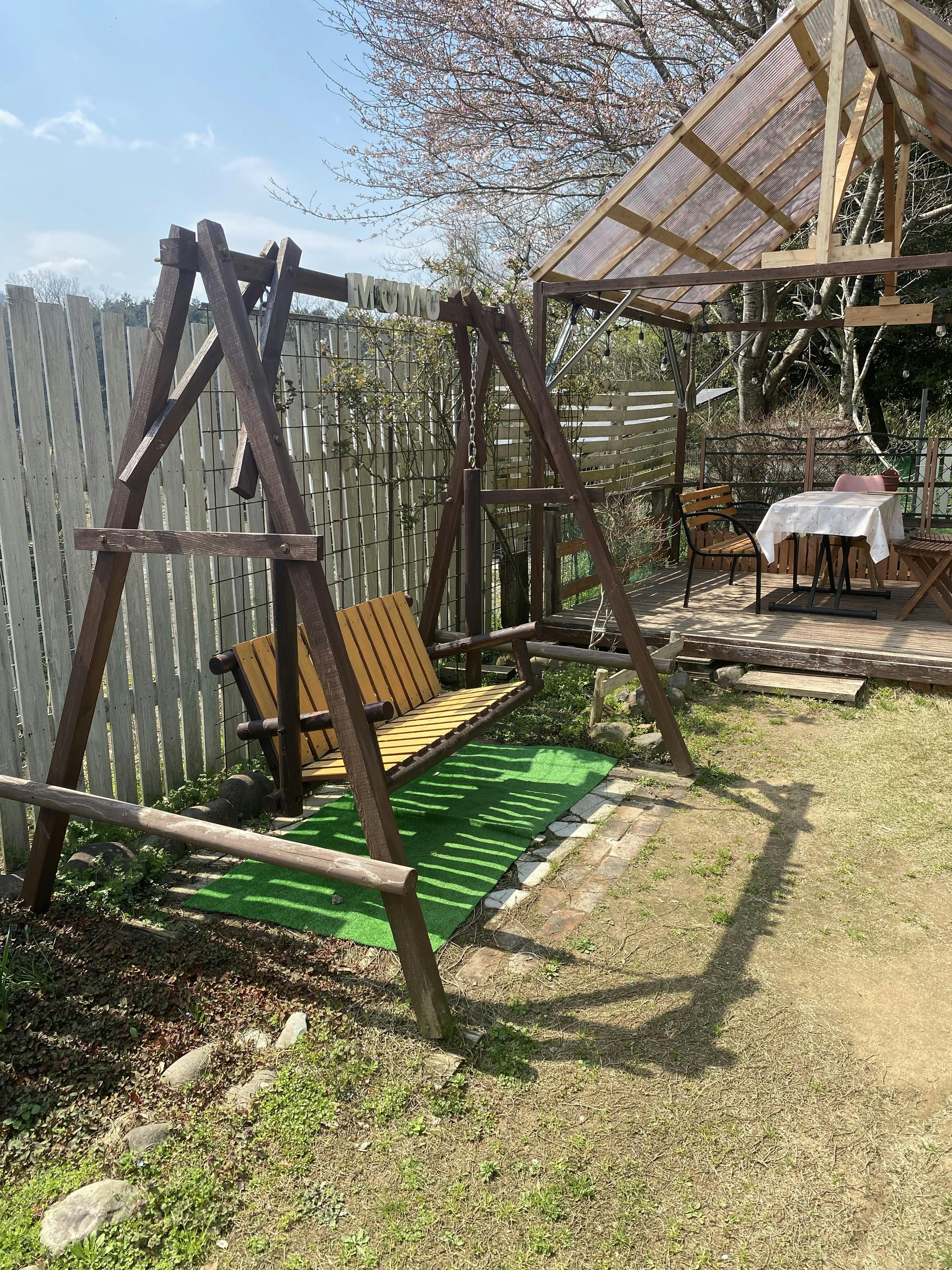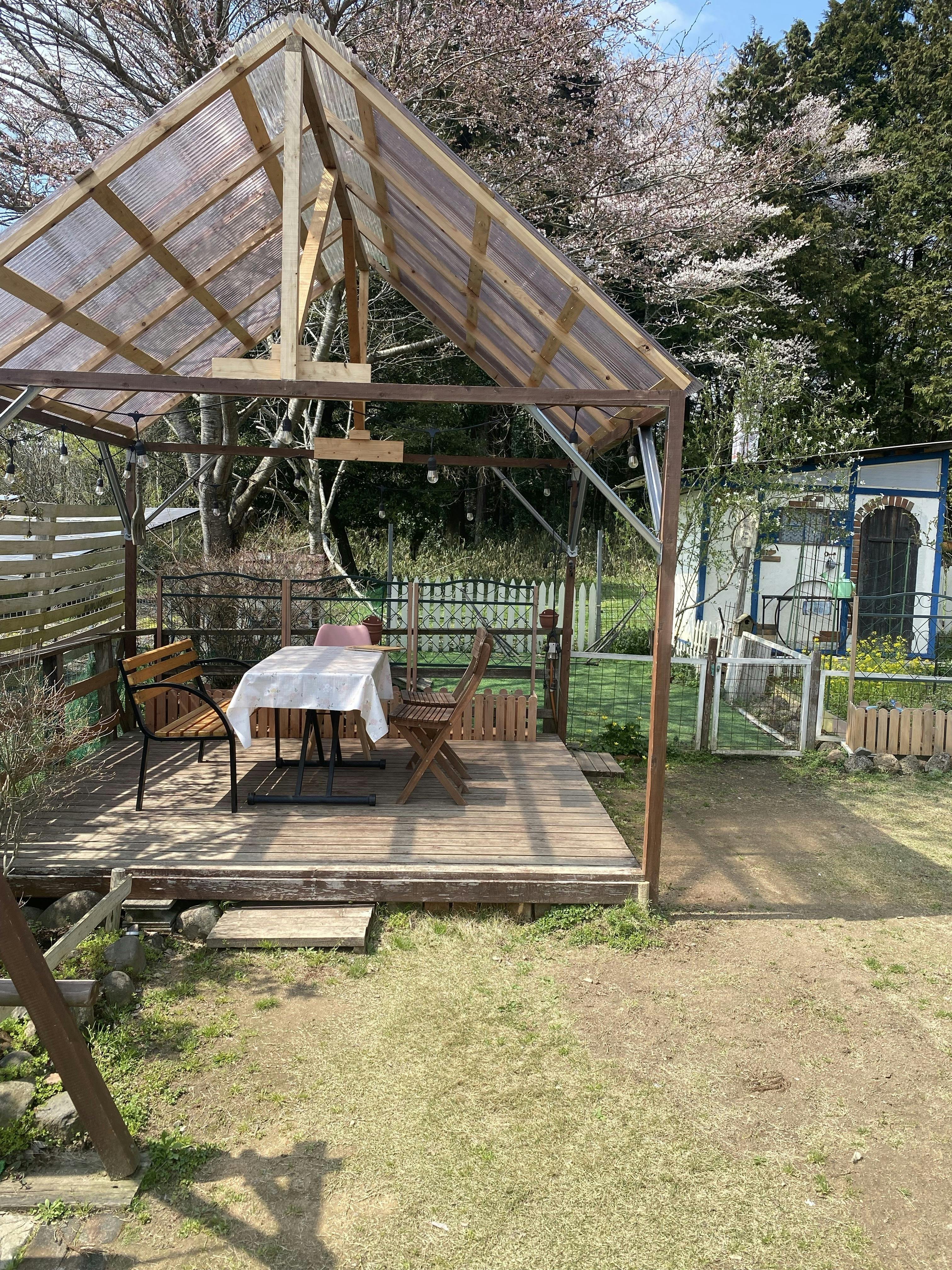 お店は、カントリースタイルが好きなオーナーさんのイメージで、木とアイアンを基調とした作りをされているそうです。テラス席もとても素敵ですが、ほとんどをDIYで作られたそう。苦行DIYをした私からすると、すごいです。こんなことできません。
