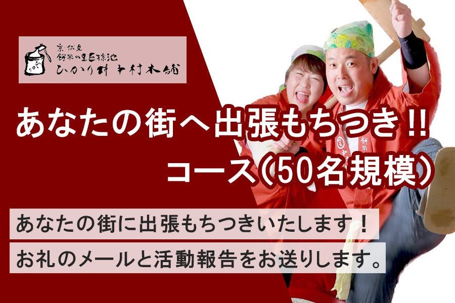 100,000円 ★あなたの街へ出張もちつき‼ コース(50名規模)★ あなたの街に出張もちつきいたします!(20~50名まで) 希望者には餅つき体験&つきたてのお餅を試食できます。 お礼のメールと活動報告をお送りします。 ※京都府内は出張費込み。他府県は交通費・ガソリン代別途要。 ※交通費・ガソリン代等実費は当日餅つき開催前にお支払いください。 ※遠方の方、お近くの方でも必ず事前にお電話で日程等のご相談をさせていただきます。 |