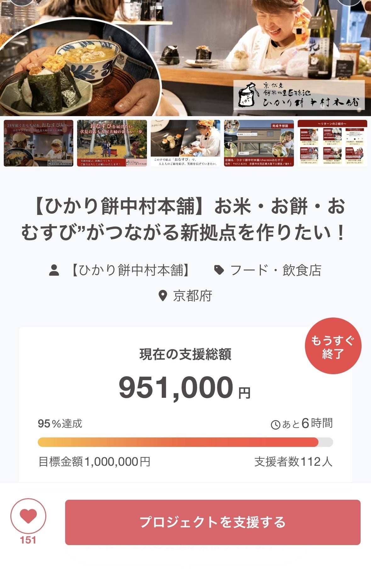 2026/04/01 12:57皆様、たくさんの応援とご支援をありがとうございました! この度、クラウドファンディングを無事に達成することができました。ご支援いただいた皆さま、本当に本当にありがとうございます。お陰様で、今回 120名もの方にご支援いただき、1,062,000円、106%という形で達成することができました。正直、ここまで来るまで不安な氣持ちもたくさんありました。それでも、応援してくださる皆さまの言葉やご支援に、何度も背中を押していただきました。私たちは夫婦二人三脚で、お米を育て、そのお米からお餅や和菓子を作り続けてきました。「美味しいお米で人を笑顔に元氣にしたい」その想いを大切にここまでやってきましたが、これからはお餅だけでなくおむすびにして、このお米の美味しさをさらに伝えていきたい!心から元氣になるおむすびです!人も地球も元氣にします!今回のクラウドファンディングを通して、その想いに共感してくださる方がこんなにもいることを実感し、胸がいっぱいです。この達成はゴールではなく、ここからが本当のスタートです。皆さまからいただいたご支援と想いを大切に、これから形にしていきます。まずは、おむすび屋を今夏オープンする為、現在の農業倉庫1階部分に、厨房設備を新設し、経年劣化した床や柱等をきれいに整えて行くことから始めます。その為の資金に充てさせていただきます。これからもどうぞ応援よろしくお願いいたします。心からの感謝を込めて。2026年4月1日ひかり餅中村本舗中村 光宏 もっと見る