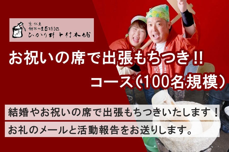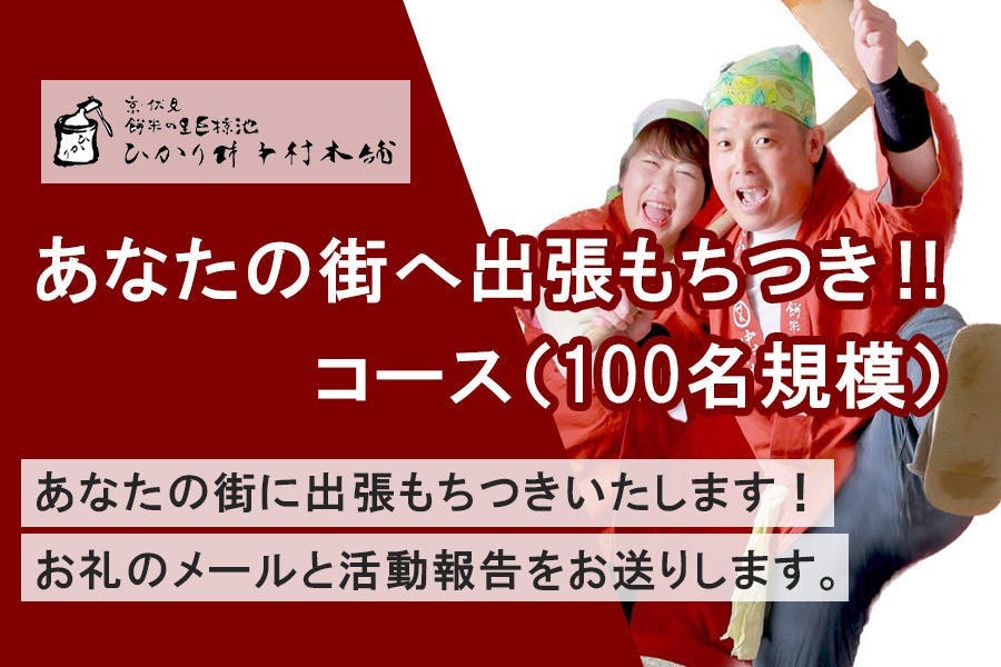 100,000円 ★あなたの街へ出張もちつき‼ コース(50名規模)★ あなたの街に出張もちつきいたします!(20~50名まで) 希望者には餅つき体験&つきたてのお餅を試食できます。 お礼のメールと活動報告をお送りします。 ※京都府内は出張費込み。他府県は交通費・ガソリン代別途要。 ※交通費・ガソリン代等実費は当日餅つき開催前にお支払いください。 ※遠方の方、お近くの方でも必ず事前にお電話で日程等のご相談をさせていただきます。 |