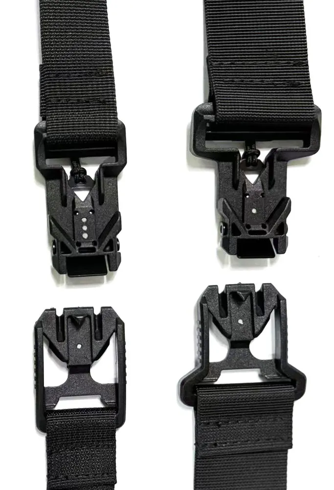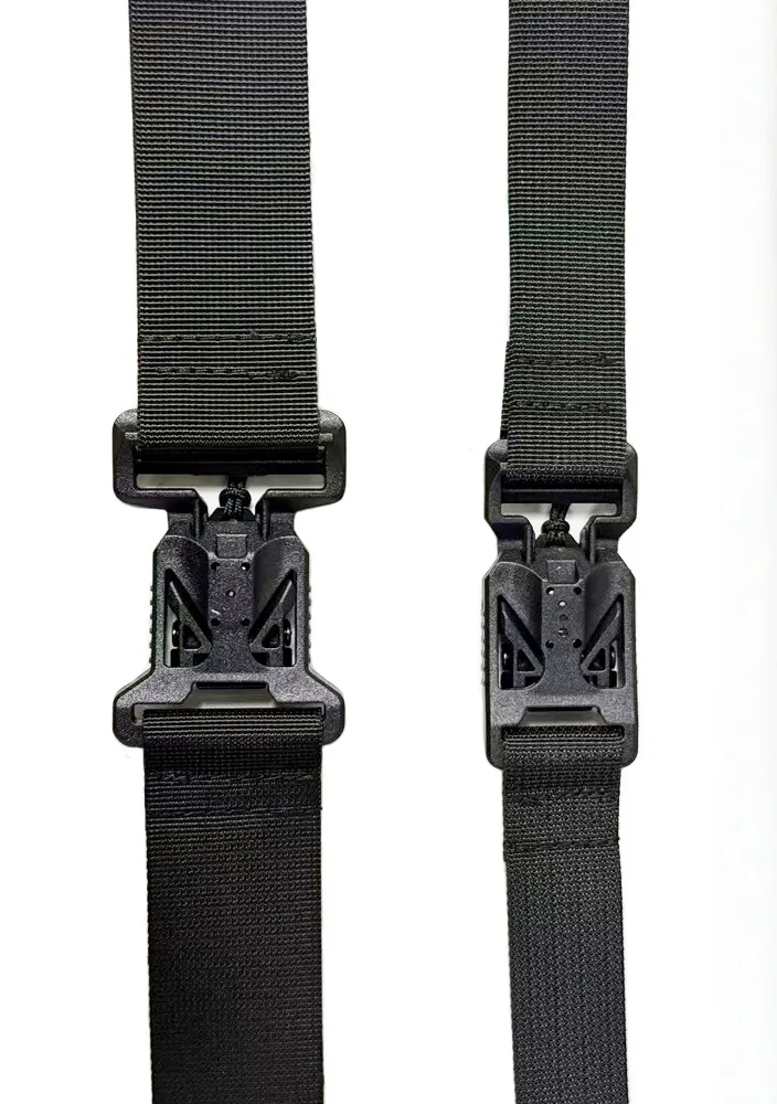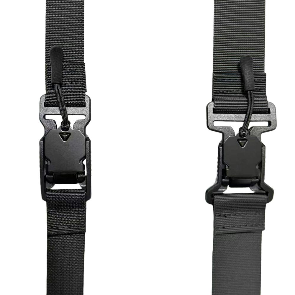左右両方を装着したら、胸の位置でバックルを留めて自分の体に合う長さに調整すれば完成です。