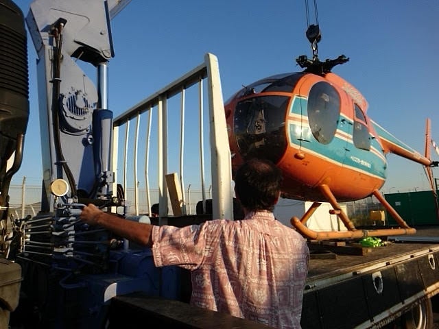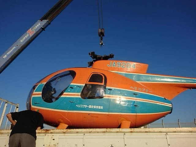 9月28日(金)午後4時、ついに阿部会員のヘリ基地より陸送されたヒューズ500が羽田空港に到着!
