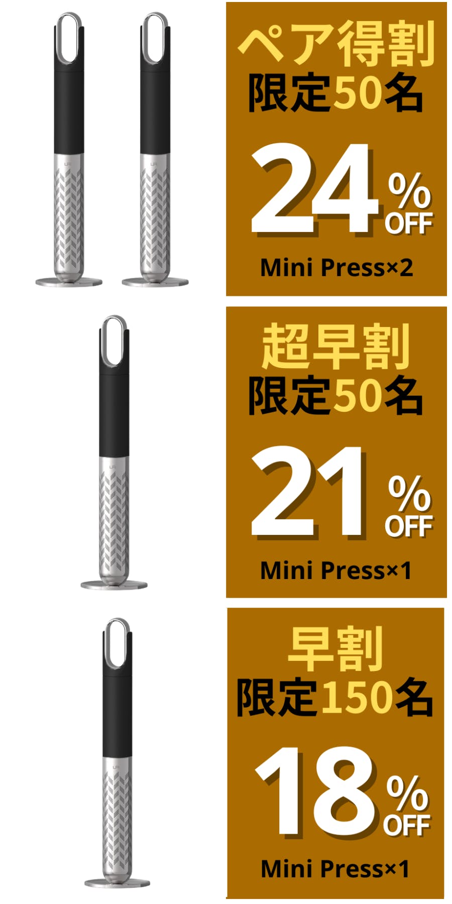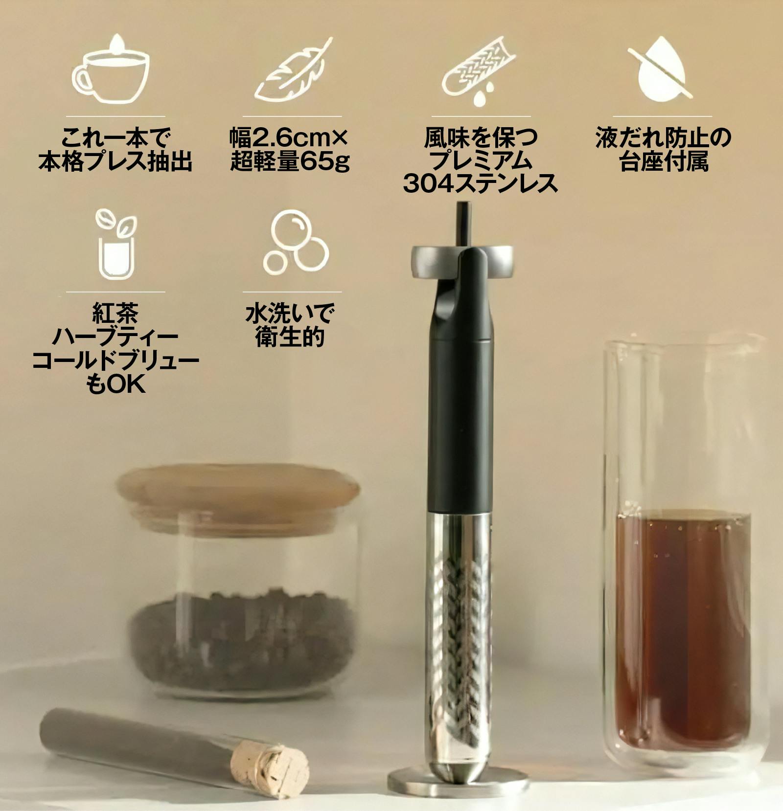 2026/02/24 12:56支援者のみなさま、そしてご検討中のみなさま、こんにちは。おかげさまで多くのメディアに取り上げていただいている本プロジェクトですが、いよいよ本日が最終日となりました。プロジェクトも残り12時間を切りましたが、一般発売予定価格よりも21%OFFとなる大変お得な「超早割」が、まだお選びいただけます!■ 現在のおすすめリターン:【超早割・21%OFF】Mini Press 1本:6,690円(税込)『Mini Press』は、これ1本でコーヒーからお茶、ハーブティーまで楽しめる、便利なマルチドリンクプレスです。インテリアにも馴染むこの1本をぜひお手元に置いていただけましたら幸いです。プロジェクト最後まで走り続けます!ご支援どうぞよろしくお願いいたします! もっと見る