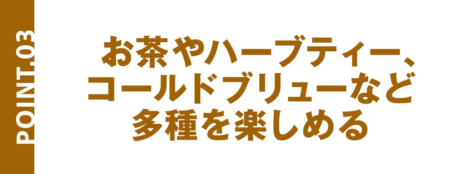 - コーヒーや紅茶、お茶やハーブティーと、多種のドリンクにマルチに対応、コールドブリューもお楽しみいただけます。