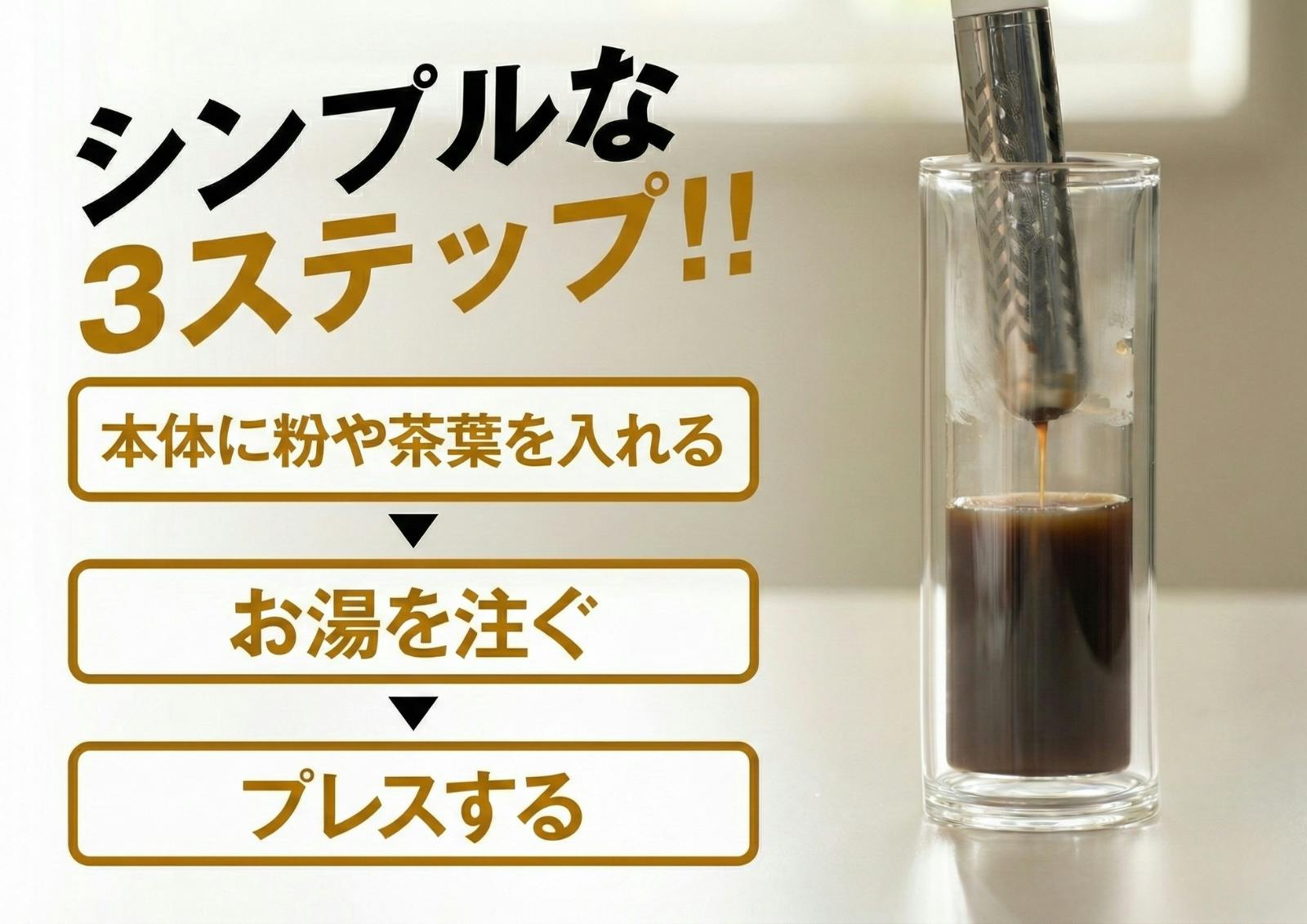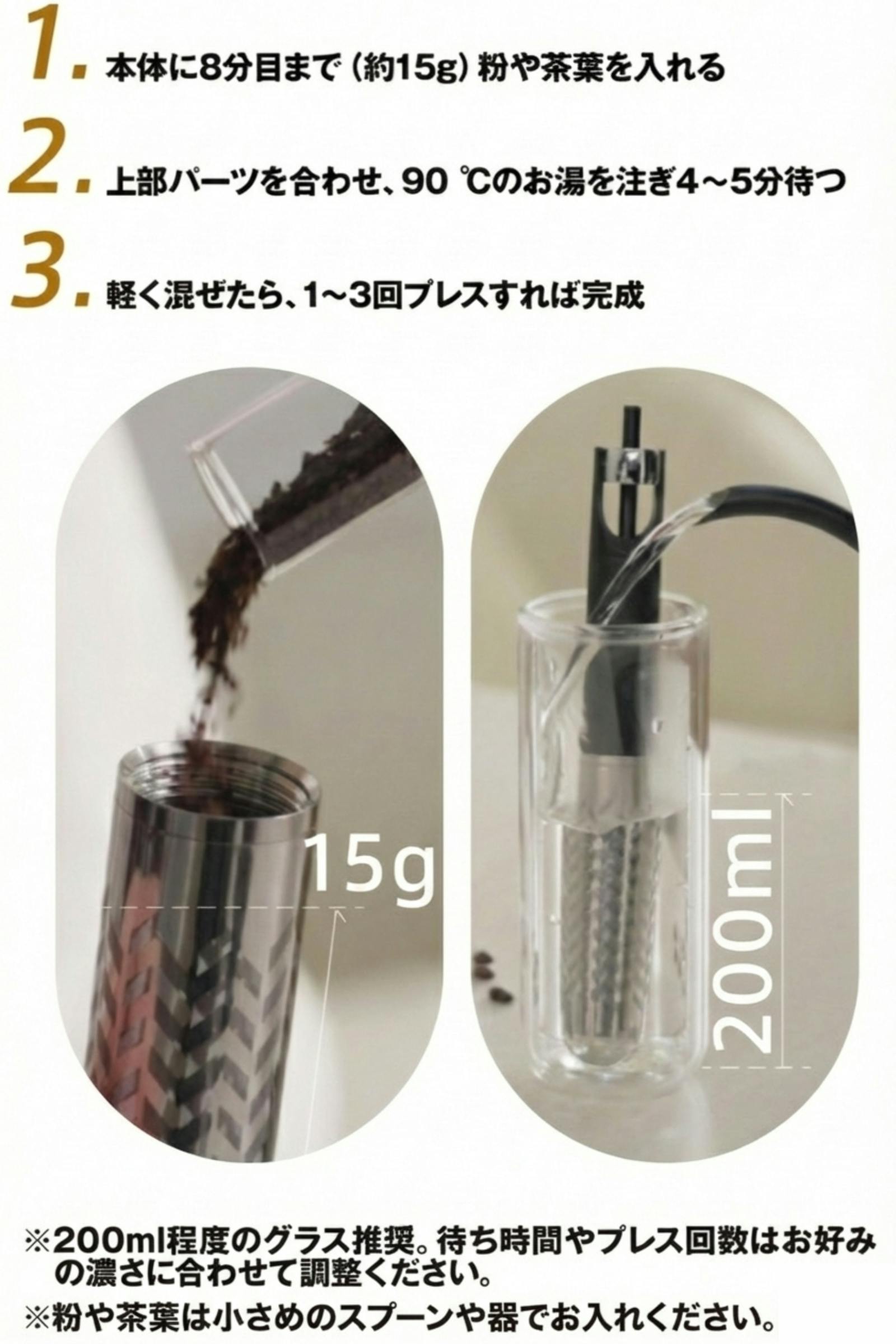 ※200ml程度のグラス推奨。待ち時間やプレス回数はお好みの濃さに合わせて調整ください。