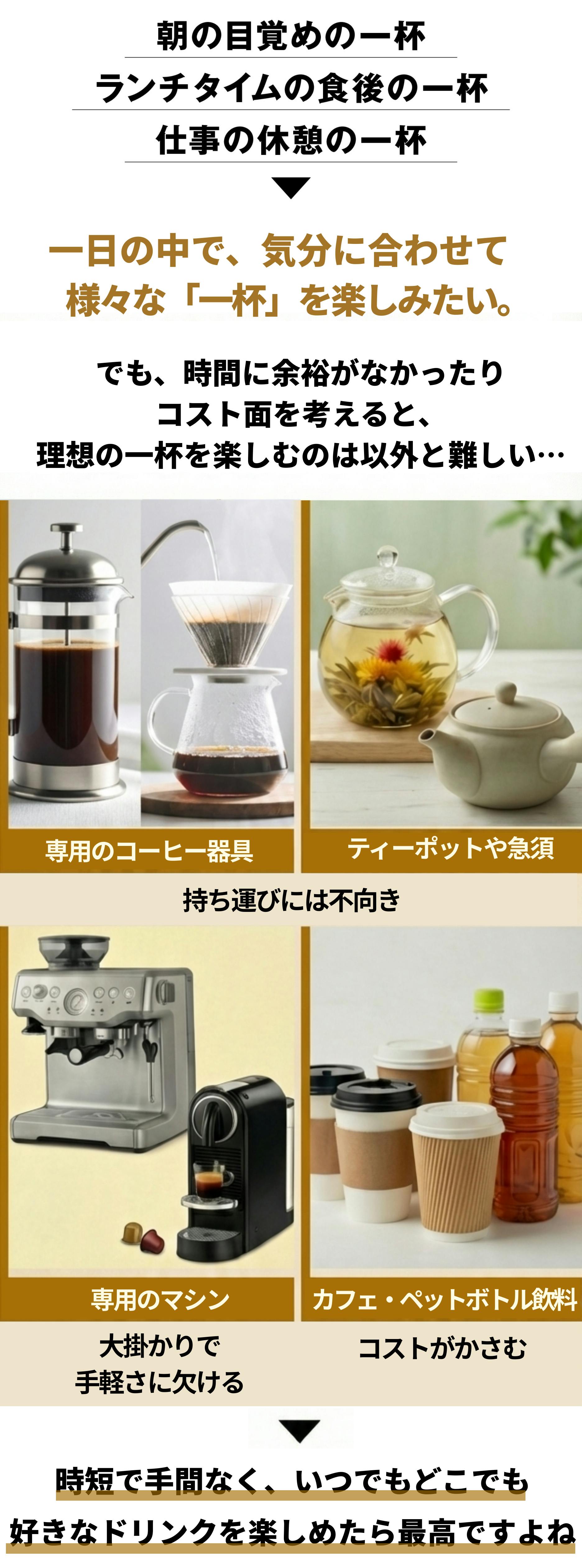 正直なところ、外出先で自分の好きな飲み物を楽しみたいとき、いつも少し諦めていました。