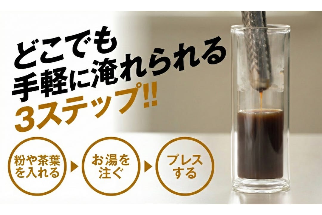 本体に粉や茶葉を入れたらそのままマグカップに入れてお湯を注ぎ、少し時間をおいたら上部のプレスを押すだけで、お好きなドリンクが完成!