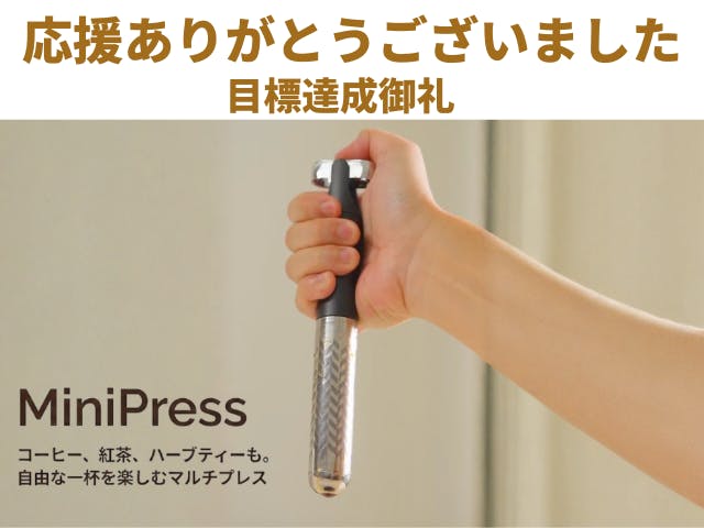 2026/02/25 10:38この度はMiniPressへの温かいご支援、本当にありがとうございます!皆様のおかげで、目標金額を上回る206%のご支援をいただくことができました。「どこでも手軽に、自分だけの一杯を楽しめる」というMiniPressのコンセプトに、多くの方から共感をいただけたことを心から嬉しく思っております。コーヒーはもちろん、ホッと一息つきたい時の紅茶や、リフレッシュのためのハーブティーなど、MiniPressはあらゆるドリンクに対応します 。驚くほど軽いこの一本が、皆様の日常の様々なシーンで活躍することを願っております。ーーーーーーーーーーーーーーーーーー【お届けについて】早速、皆様へリターンをお届けするための出荷準備を進めております!当初3月の発送を予定しておりましたが、メーカーの尽力によりすでにMini Pressが日本に入荷いたしましたので、早々に手配をはじめ、2月末〜3月頭までの配送を目指してスタッフ一丸となって頑張っております。まもなくMini Pressをお手元にお届けいたしますので、お待ちくださいませ。【お願い:配送先住所のご確認】スムーズに発送を行うため、ご登録の配送先住所に間違いがないかご確認をお願いいたします。もし修正が必要な場合は、お早めにお届け先情報をご修正いただくか、ご連絡いただけますようお願い申し上げます。※住所不明や長期不在により製品が返送となってしまった場合、誠に恐れ入りますが、再発送の際の送料につきましては、「着払い(実費)」でのご負担をお願いしております。ーーーーーーーーーーーーーーーーーーお届けまで、引き続きどうぞよろしくお願いいたします! もっと見る