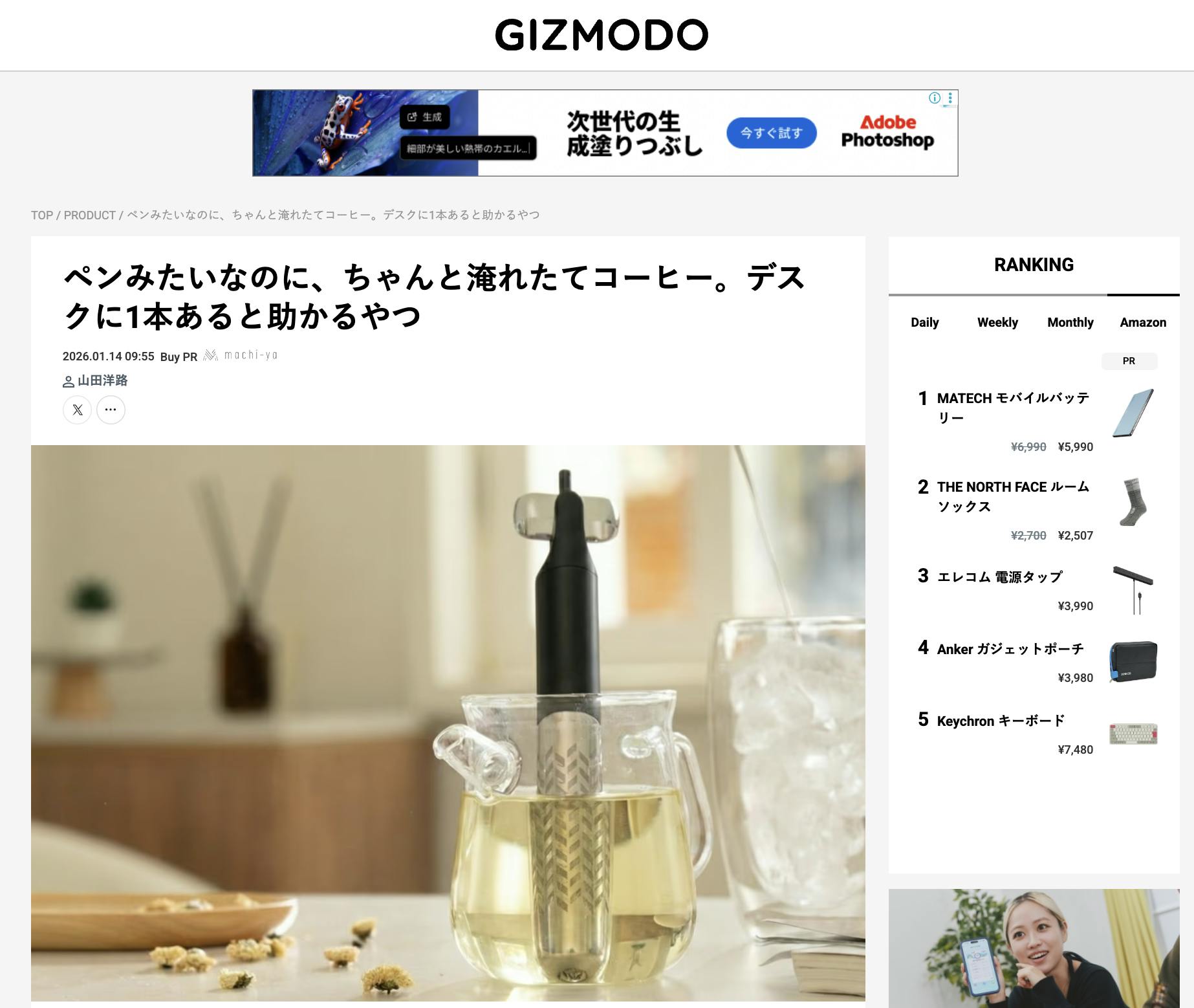 最新のガジェットやテクノロジーを紹介する日本最大級のウェブメディア「ギズモード・ジャパン(GIZMODO JAPAN)」にて、現在挑戦中のペン型ドリンクプレス『Mini Press』をご紹介いただきました!