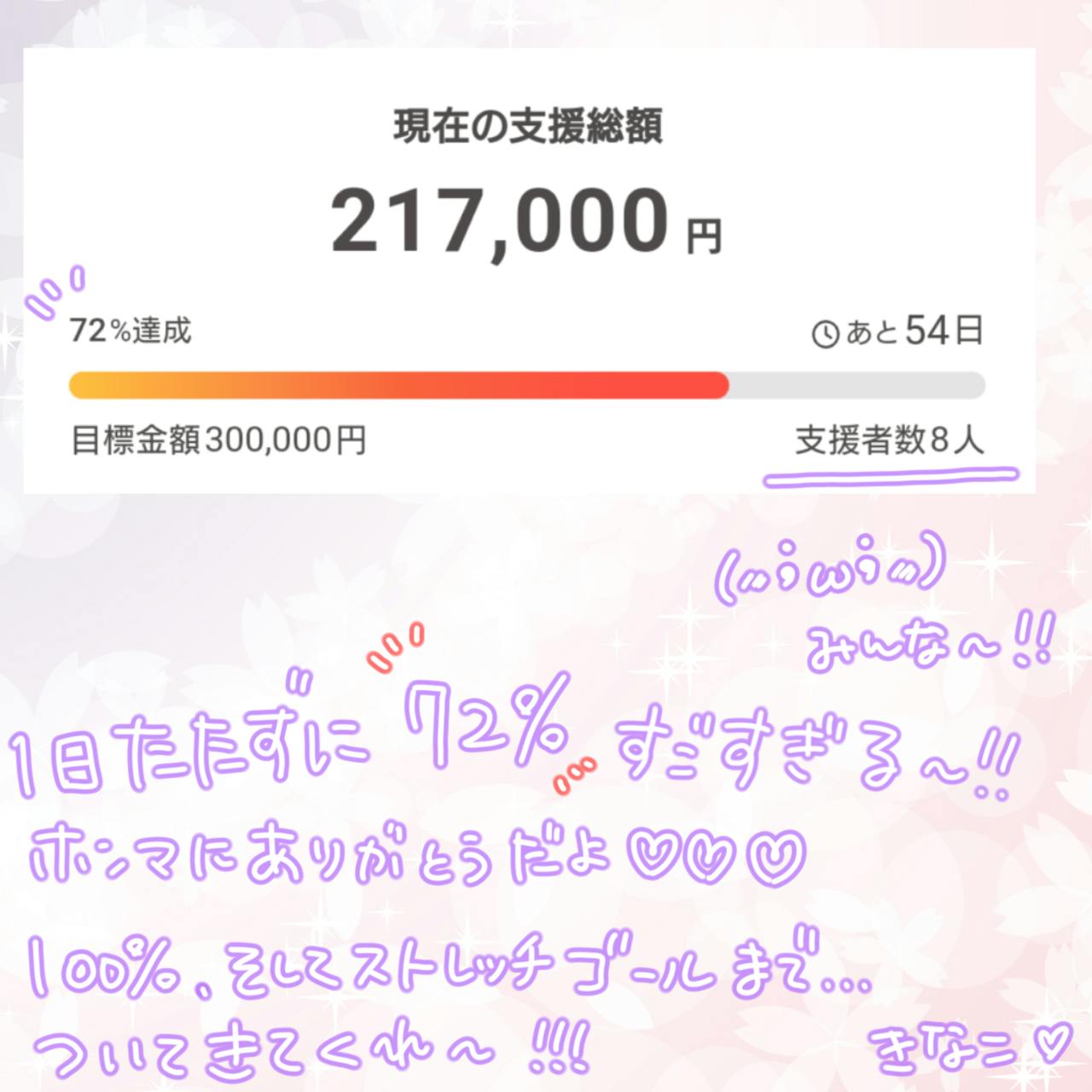 開始からわずか3時間で達成率66%……ビックリと嬉しいが混ざって変な顔になっちゃったよ!!