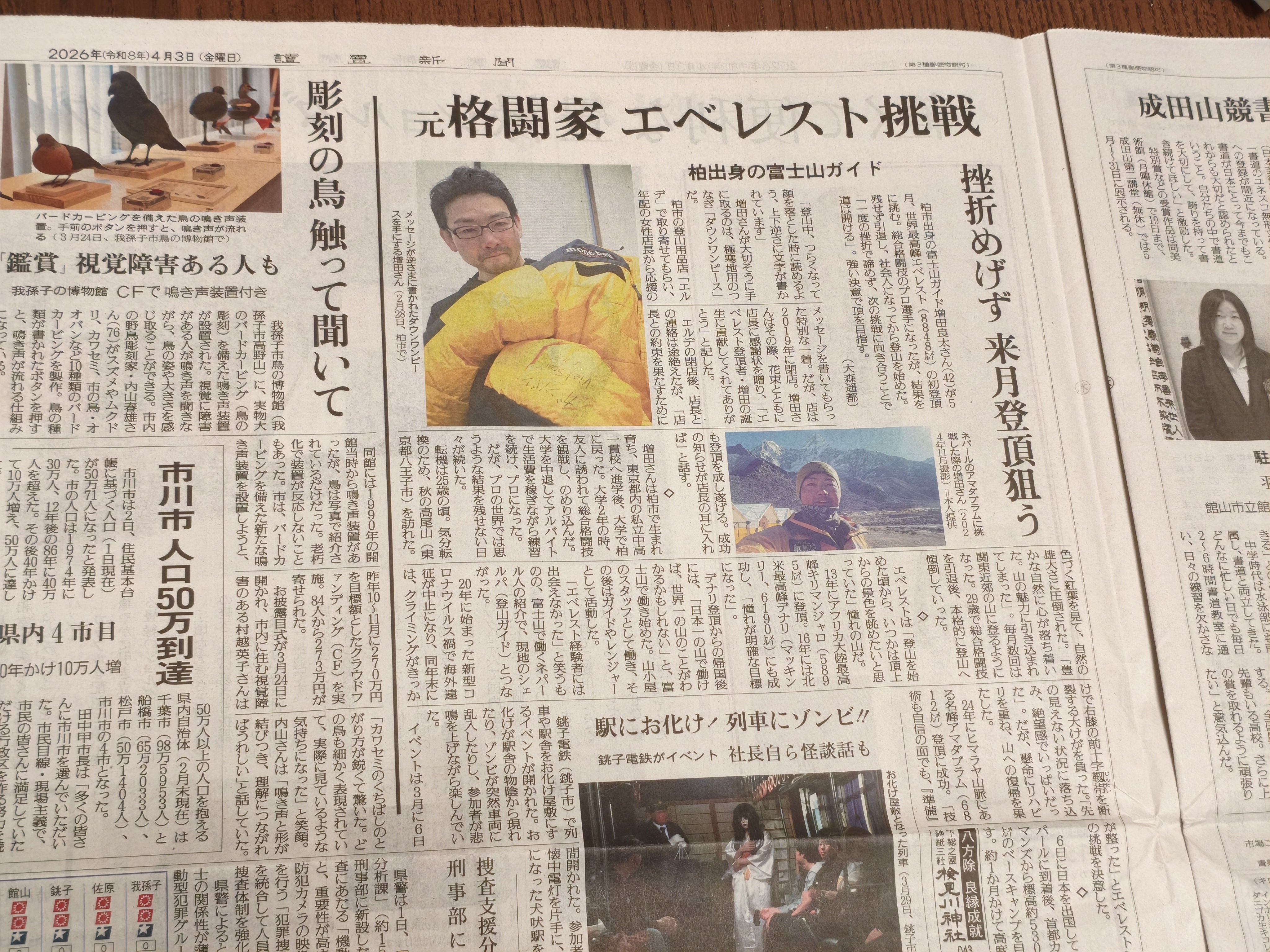 2026/04/04 11:44読売新聞の3月29日山梨地域欄、4月3日千葉県地域欄にてそれぞれ掲載していただきました。登頂して再び記事にしていただけるよう、写真を沢山撮って来たいと思います。読売新聞様、取材と掲載ありがとうございました。https://www.yomiuri.co.jp/local/yamanashi/news/20260329-GYTNT00001/ もっと見る