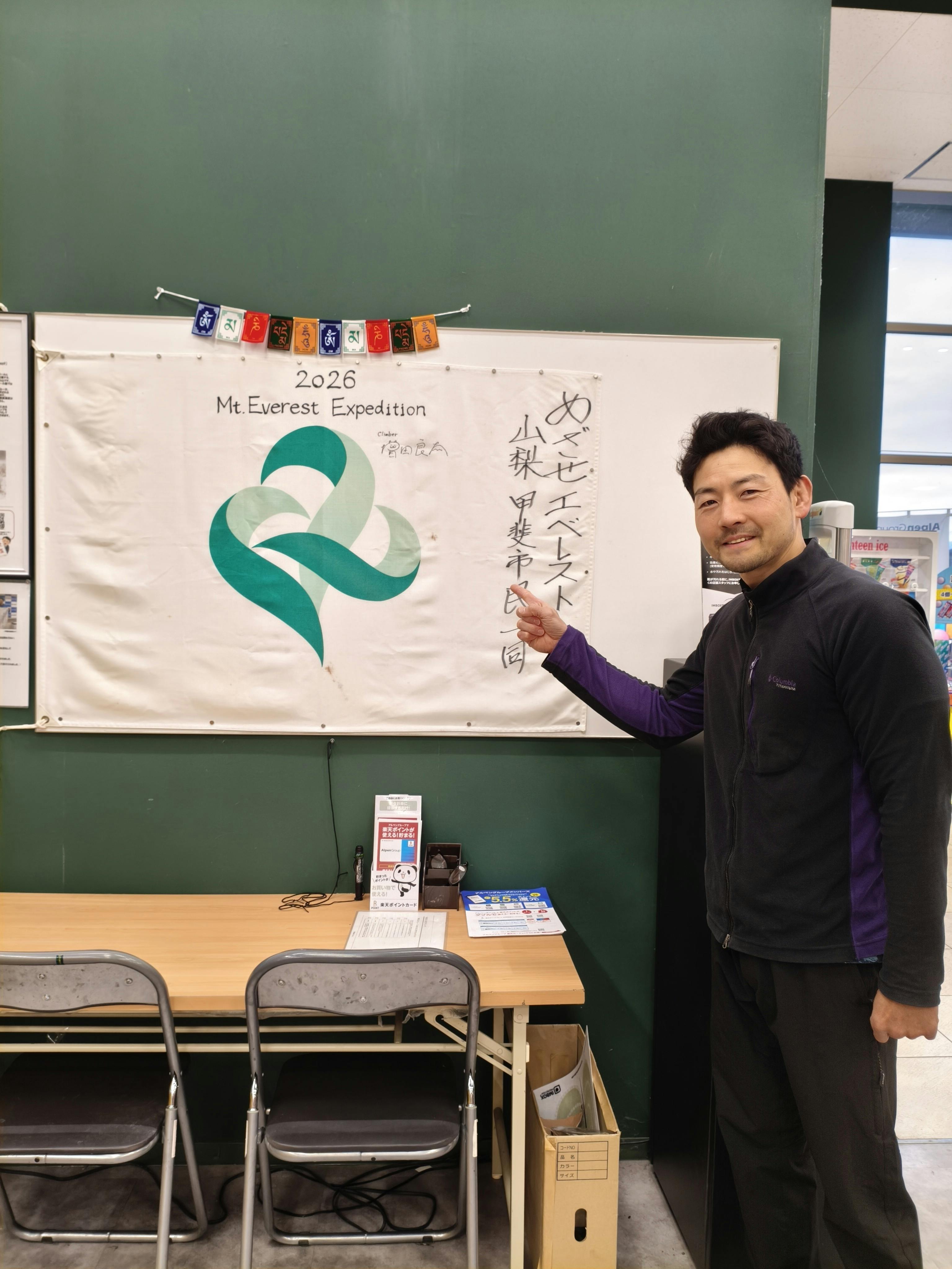 来店された方々に“応援メッセージ”を書いてもらい、それらの言葉と共に世界最高峰の頂に立ちます。