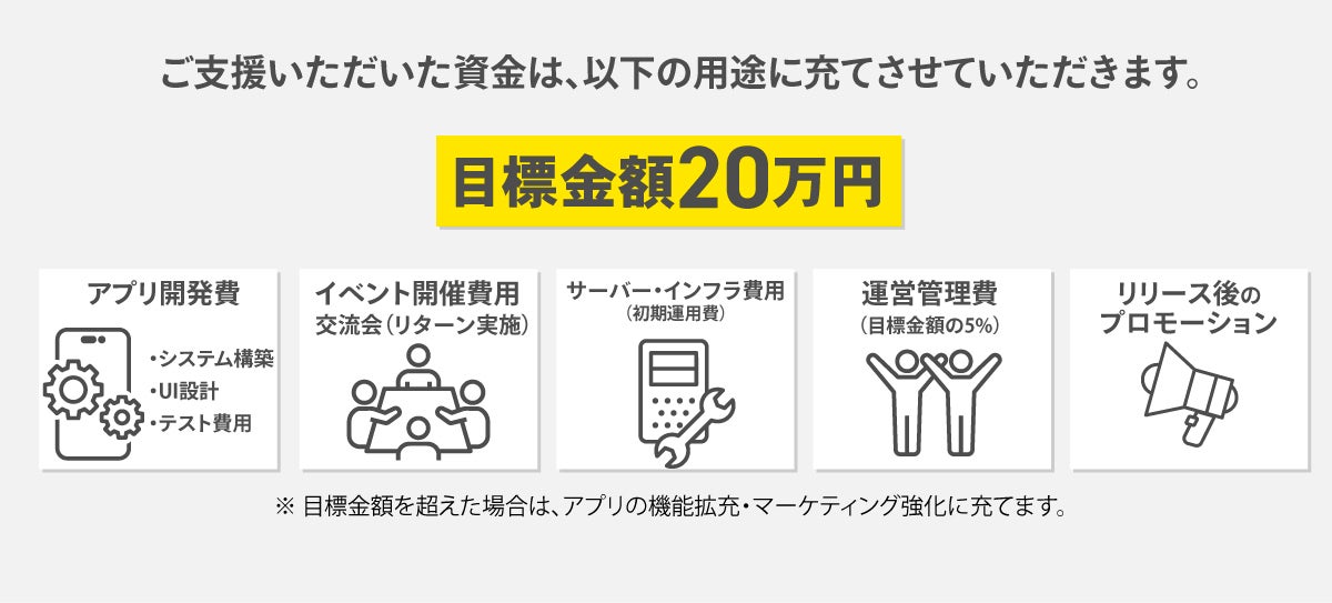 ※ 目標金額を超えた場合は、アプリの機能拡充・マーケティング強化に充てます