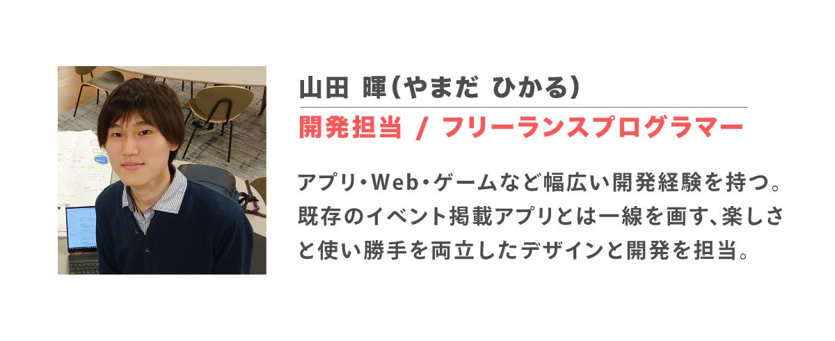 アプリ・Web・ゲームなど幅広い開発経験を持つ。既存のイベント掲載アプリとは一線を画す、楽しさと使い勝手を両立したデザインと開発を担当。