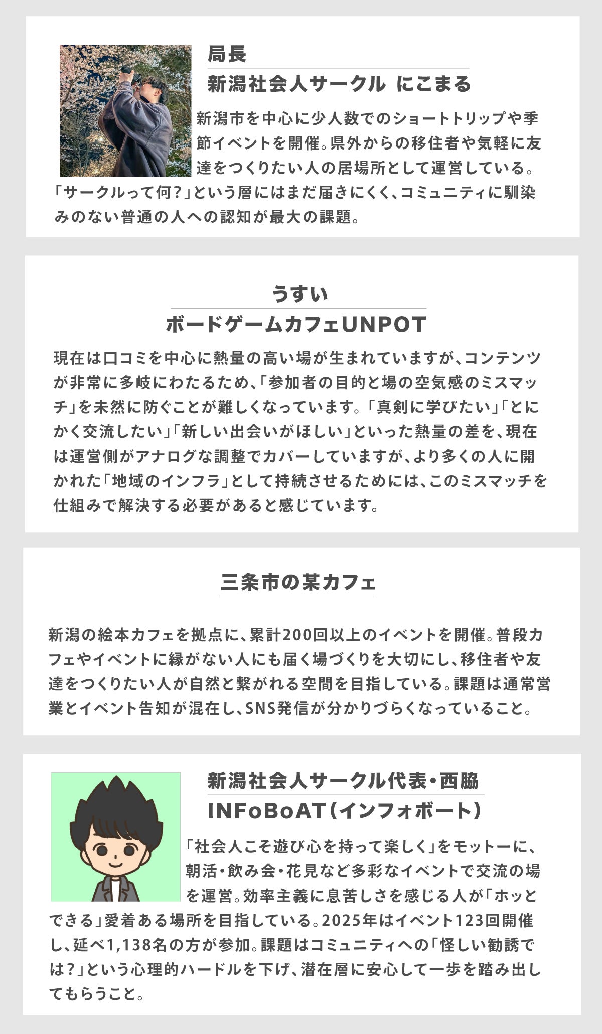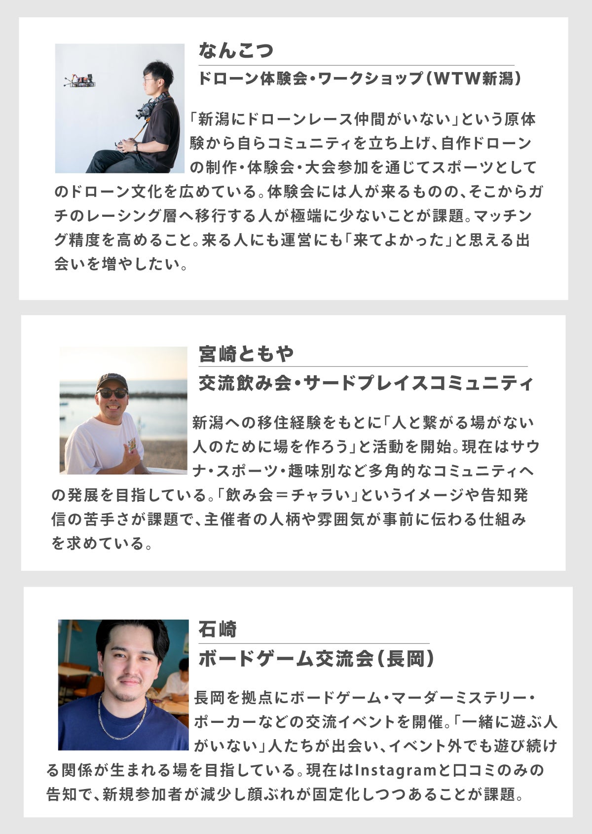 Lockerを開発するにあたり、新潟で実際にローカルイベントを運営している13名の方々にお話を伺いました。