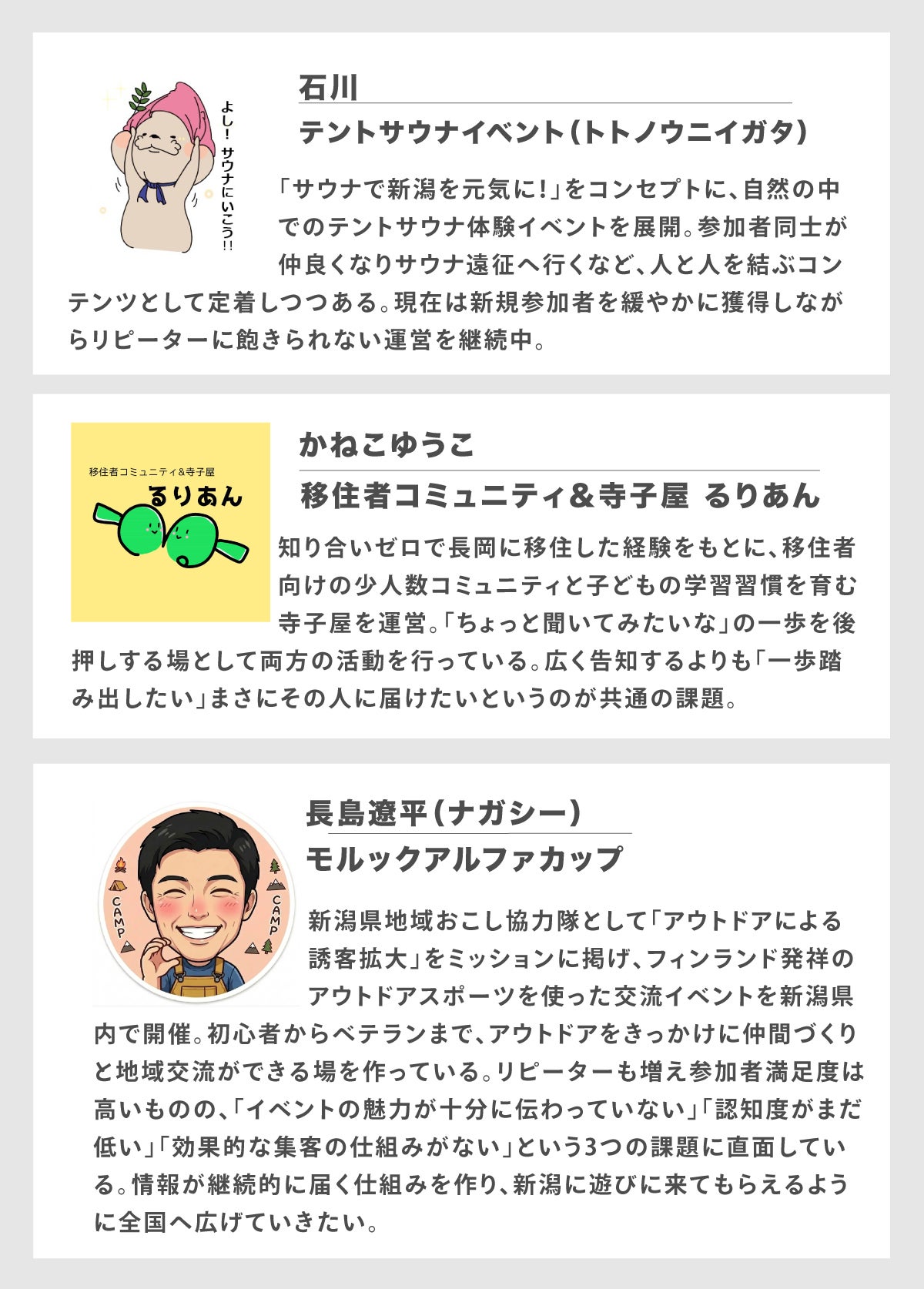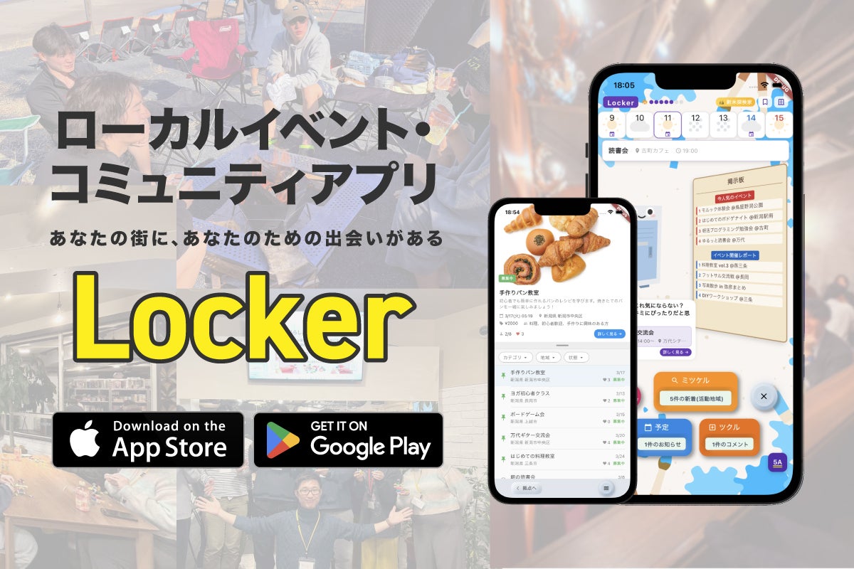 「地域の孤独」をなくすため、10〜20人規模のローカルイベントに特化したアプリ「Locker」を開発。移住者や転勤者でも安心して参加できる仕組みで、人と人が自然につながる場を提供します。新潟から始め、全国へ展開予定。