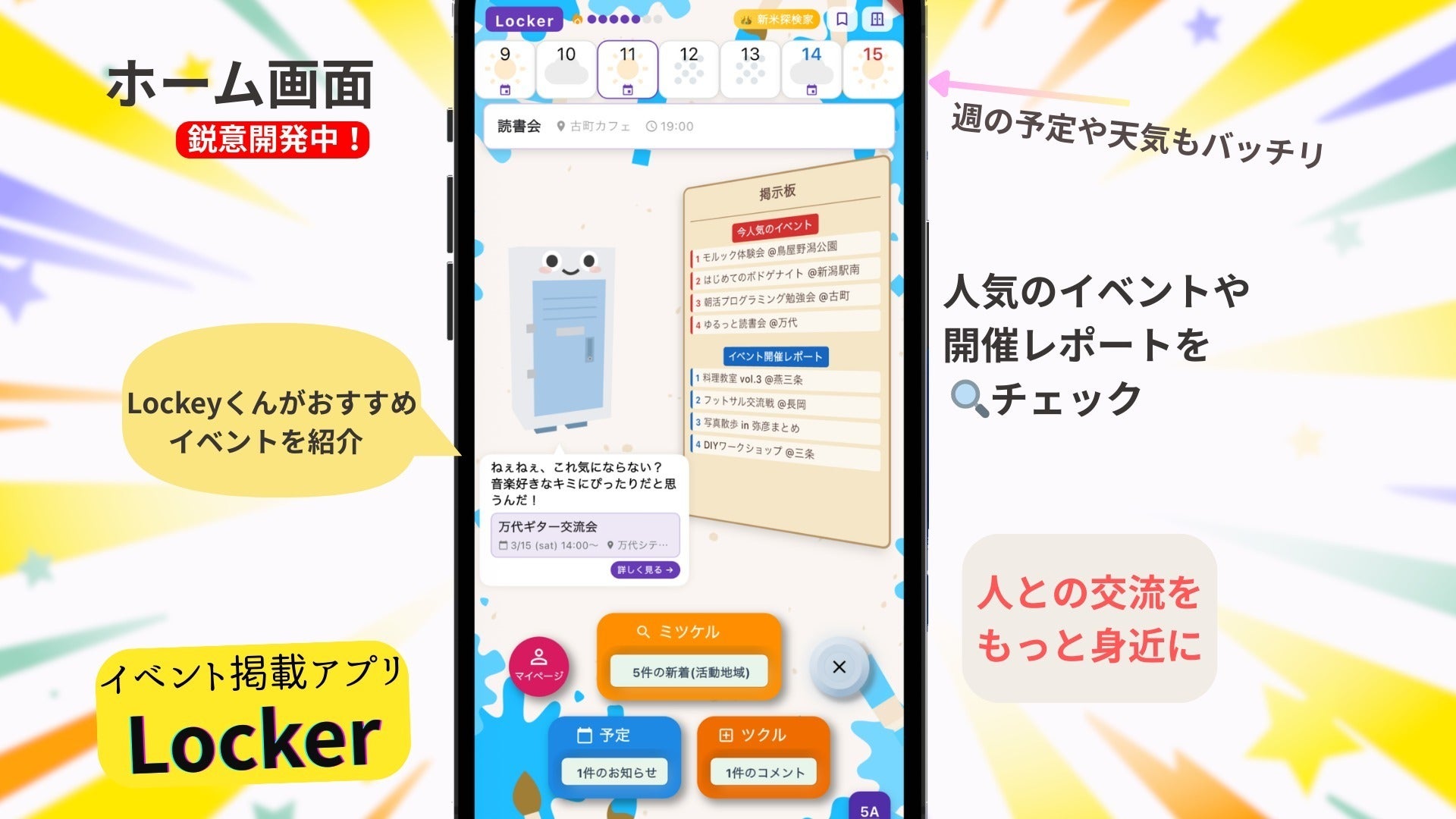 ホーム画面には、今週の予定・天気・人気イベントランキング・開催レポートが一覧表示されます。AIキャラクター「Lockeyくん」があなたの興味に合ったイベントをピックアップして提案してくれるので、自分で探さなくても「ちょうどいいイベント」が自然と見つかります。