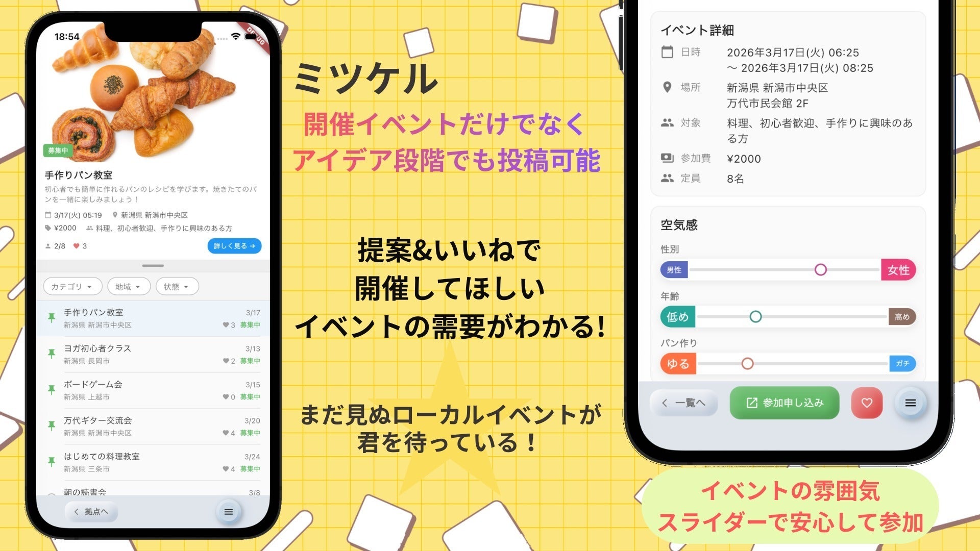 「どんな人が来るのか不安」という心理的ハードルを取り除き、初めての参加でも安心して踏み出せる仕組みです。また、まだ企画中のアイデア段階でも投稿でき、いいねの数で需要が可視化されるため、主催者が「本当に求められているイベント」を開催できます。