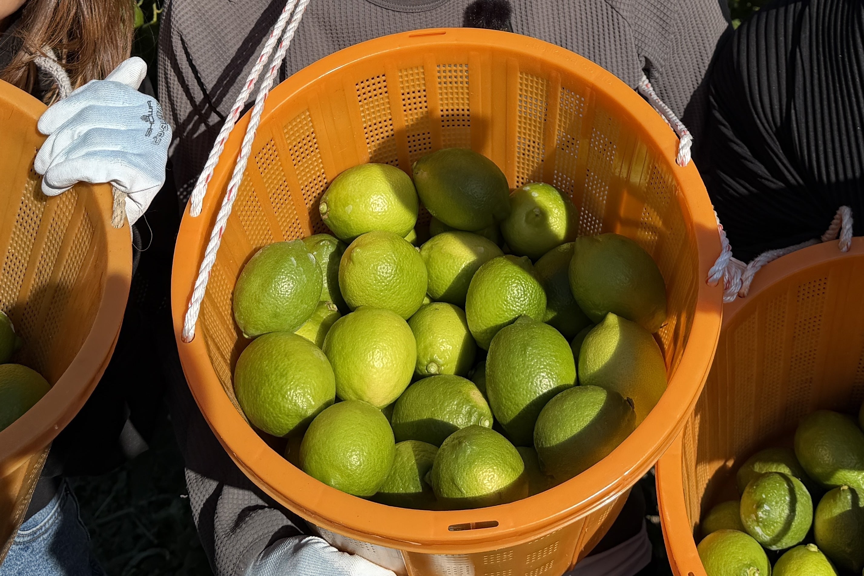 藤井さんのレモン畑は7ヘクタール。サッカーコートにすると約10面分、東京ドーム約1.5個分に相当する広さです。収穫には、虫よけスプレー、収穫かご、手袋、専用のハサミが欠かせません。レモンには鋭いトゲがあり、実を傷つけないように慎重に作業を進めます。