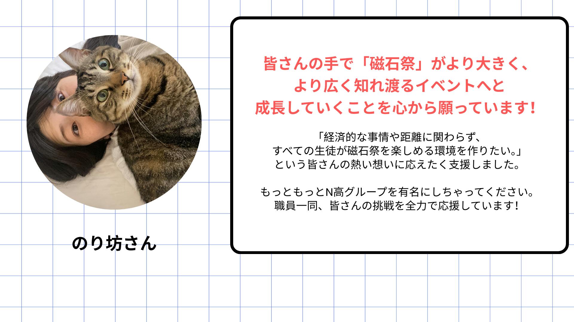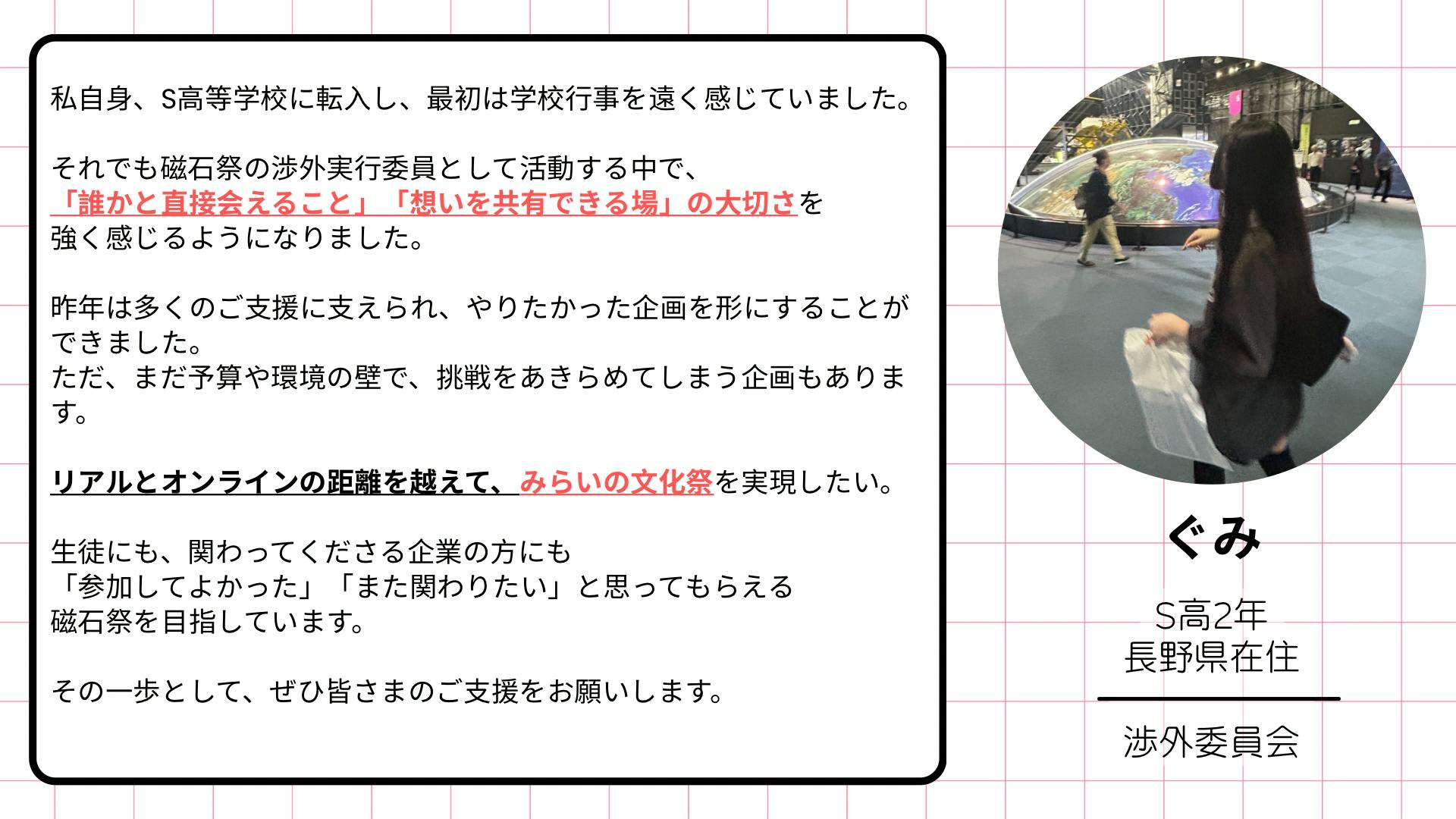 この文化祭は、在校生が楽しむだけではなく、卒業生・保護者・教職員の方をはじめとした生徒以外の皆さんも含め、世代を超えて多くの仲間が繋がれる場にしていきたいです。