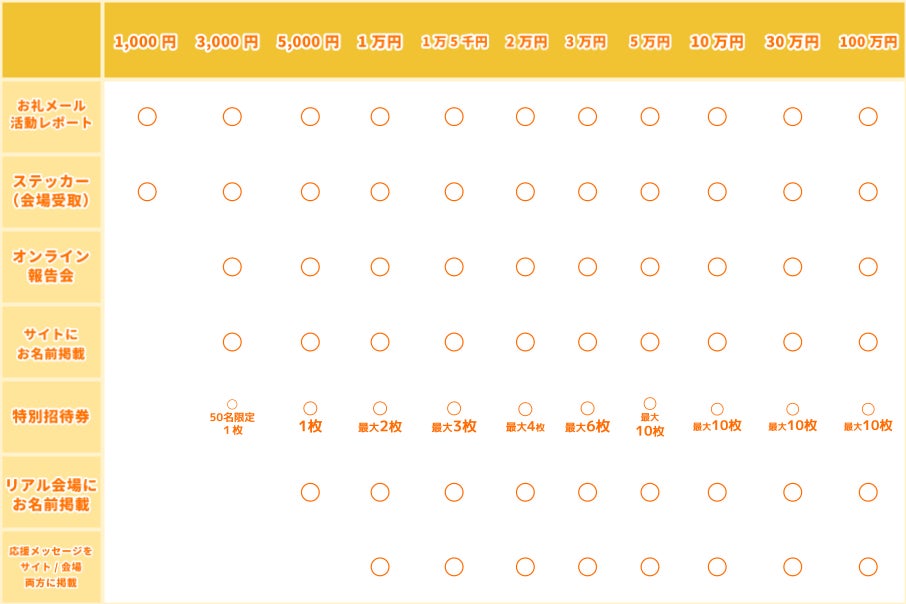 感謝のメッセージから始まり、オンライン報告会への参加権など、支援額に応じて選択いただけます。