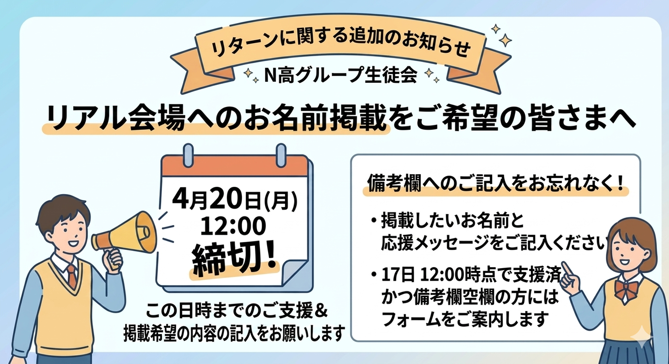 リアル会場でのお名前掲載・応援メッセージ掲載は、4月20日(月)12:00までにご支援いただいた方のうち、備考欄に掲載希望のお名前・応援メッセージをご記入いただいた方を対象とさせていただきます。