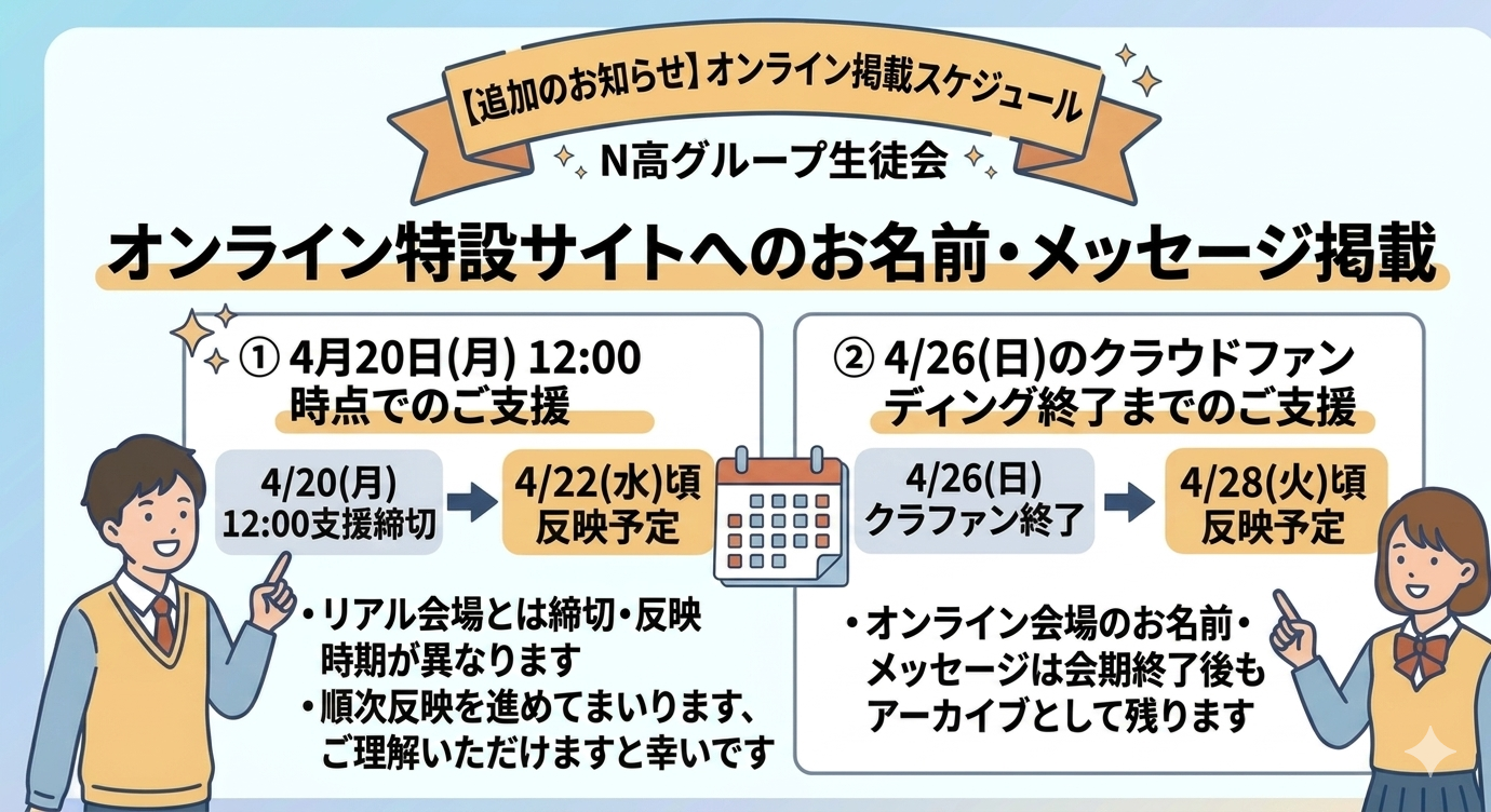 オンライン特設サイトへのお名前・応援メッセージ掲載については、リアル会場とは締切・反映時期が異なります。