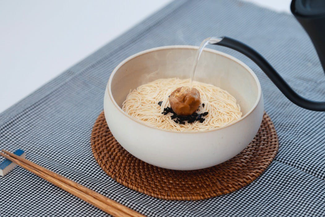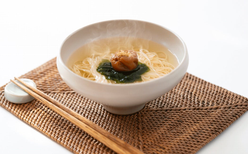 紀州南高梅とわかめの食べ合わせ。温めることで梅の風味が柔らかくなるので温素麺との相性もばっちり!優しい梅とわかめの風味を味わえます。