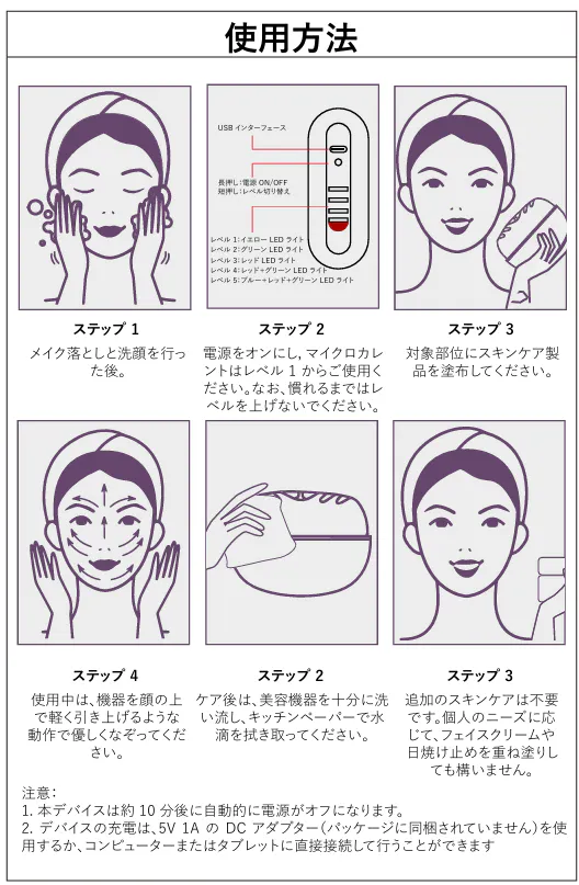 ・使用方法 以下の通り(日本語取扱説明書より抜粋説明) 洗顔後、美容液を顔に塗布して、美顔器でケアする方法。マイクロカレントはレベル1から使用して、慣れるまでレベルを上げないで下さい。