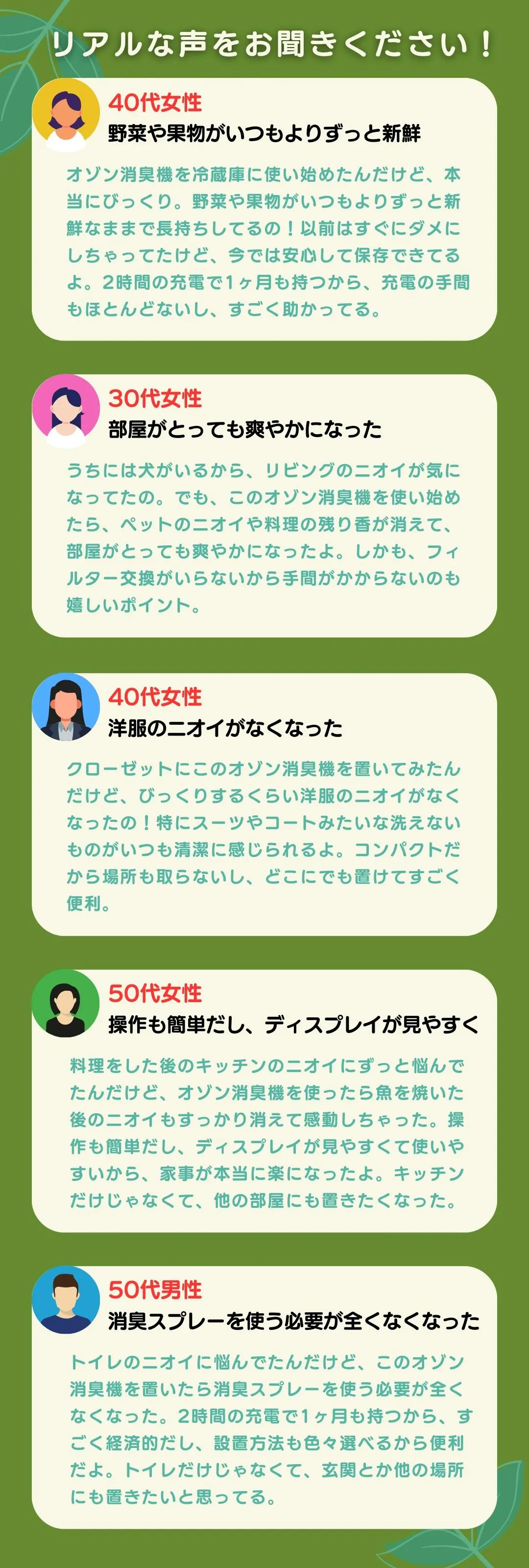 この商品は、より良い生活環境を提供し、日常の煩わしさを少しでも軽減するために生まれました。お客様がいつでもどこでも清潔で快適な空間を楽しめるように、私たちはこのオゾン脱臭機の開発に全力を注ぎました。
