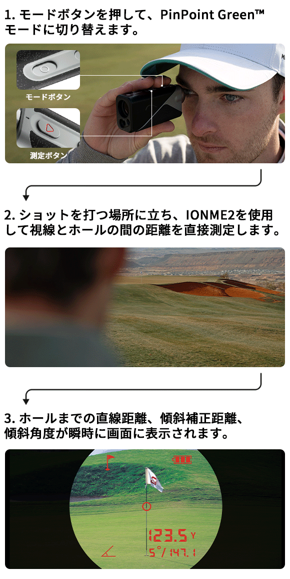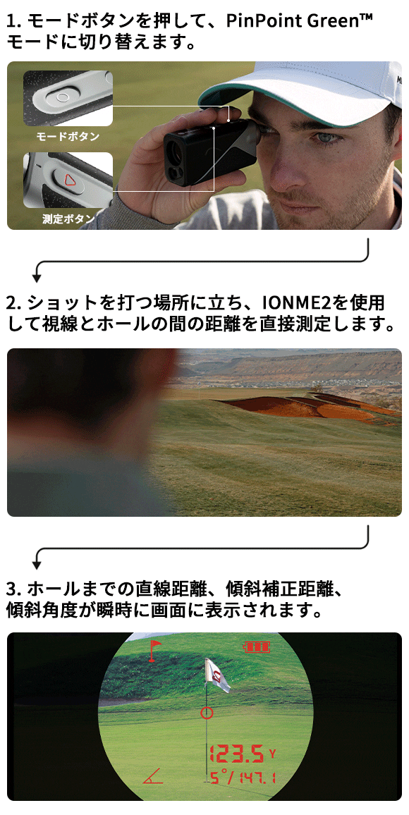 A3:PinPoint Green™ は IONME2 に搭載された特許技術 で、ボールとカップの間の距離や傾斜を高精度で測定する機能です。測定精度は ±1 インチを誇り、プレーヤーに正確なデータを提供します。特に、目標を迅速にロックオンするアルゴリズムが強化されており、旗竿やグリーン上のターゲットをすばやく検出できます。さらに、悪天候時でも安定した測定を可能にするスマートターゲットフィルタリングを備えており、雨や霧の影響を受けにくい設計になっています。