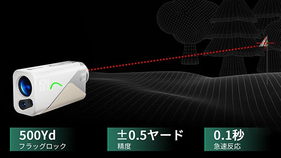 産業用レーザー距離計で培った高度な技術を応用し、IONME2は最大約1000メートル(約1100ヤード)の超長距離測定を実現。さらに、わずか0.1秒の高速測定により、手振れの影響を最小限に抑え、コース全体を素早く、正確に把握できます。
