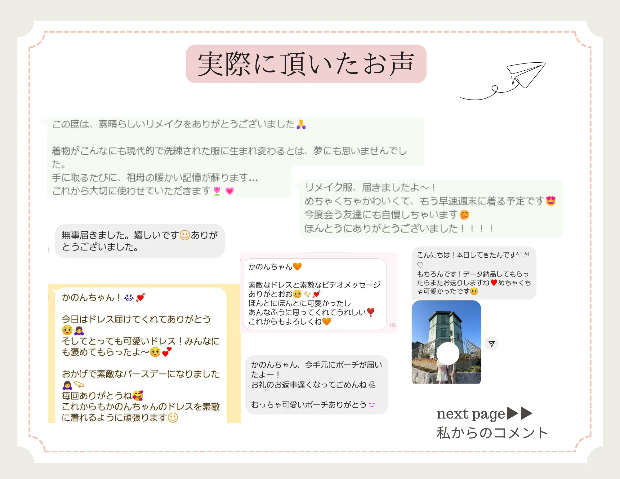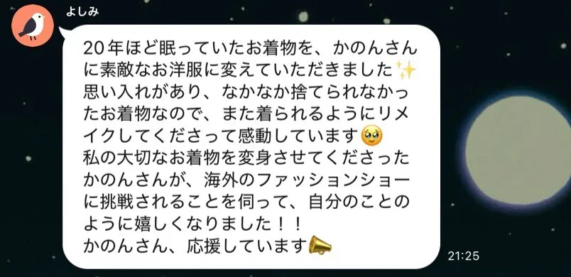実際に着物リメイクの思いに賛同し、ご自身の着物からリメイクをオーダーしてくれた方からは、このようなコメントをいただいています