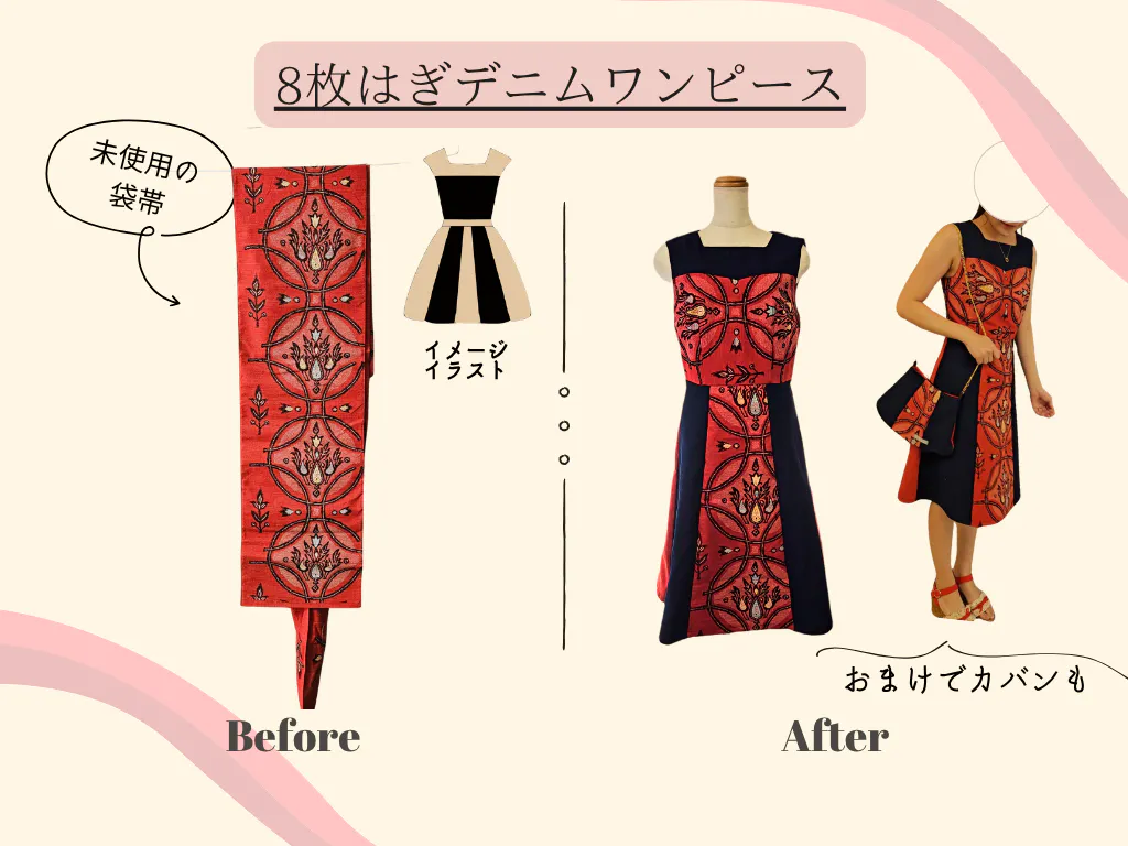 着物の柄や生地の特徴を活かしながら、ワンピースやドレスなど、日常でも特別な日でも楽しめる一着へと仕立てます。