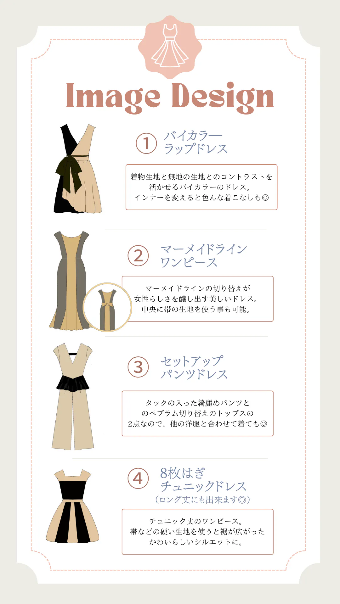 打ち合わせを通して、デザイン・シルエット・用途などをお伺いしながら、あなただけの一着を制作いたします!結婚式やお祝い事用のドレスから普段着まで、大切な思い出の着物を、今の自分が着られる洋服へと生まれ変わらせます。