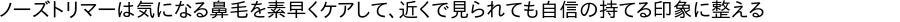 ノーズトリマー:鼻毛ケアで近距離でも清潔感アップこれ1台で「剃る・洗う・整える」まで完結するオールインワン設計です。