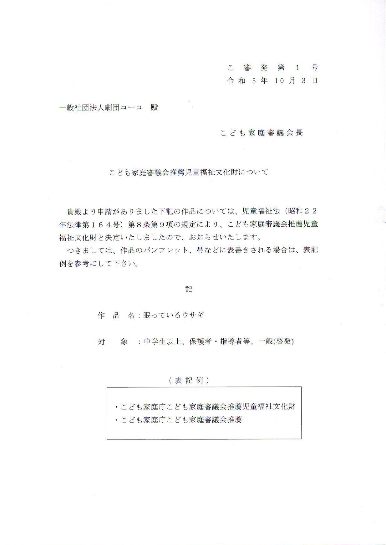 『眠っているウサギ』は2019年12月の初演以来、大阪を中心に全国各地で上演され、どの地域でも観客の皆様から高い評価をいただいてきました。実際の社会事件を題材にしながらも、単に事件を描くだけでなく、その背景にある現代社会の問題を深く掘り下げた作品として認められており、2023年度には「こども家庭庁こども家庭審議会推薦児童福祉文化」に選定されました。